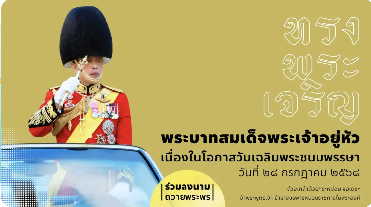 สำนักพระราชวัง ขอเชิญชวนประชาชนร่วมลงนามถวายพระพรชัยมงคลพระบาทสมเด็จพระเจ้าอยู่หัว เนื่องในโอกาสวันเฉลิมพระชนมพรรษา วันที่ ๒๘ กรกฎาคม ๒๕๖๘ ผ่านระบบออนไลน์