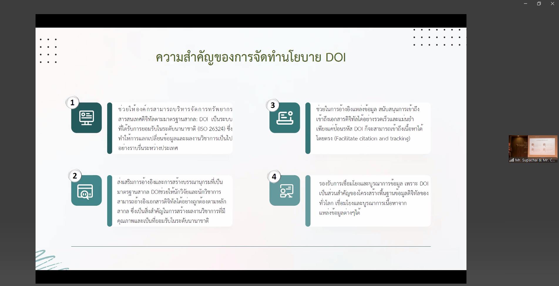 บุคลากรหอสมุดแห่งชาติรัชมังคลาภิเษก เชียงใหม่ เข้าร่วมการอบรมพัฒนาศักยภาพบุคลากรเรื่อง “มาตรฐานรหัสทรัพยากรสารสนเทศดิจิทัล (Digital Object Identifier : DOI) กับการจัดการมรดกภูมิปัญญาของหอสมุดแห่งชาติ” ผ่านโปรแกรม Zoom Meeting
