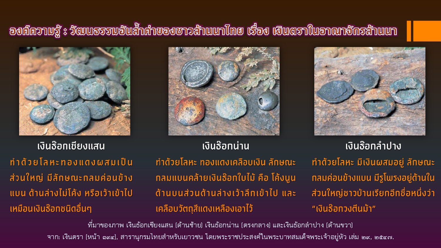 นวรัตน์ เลขะกุล. เงินตราล้านนา. เชียงใหม่: นพบุรีการพิมพ์, ๒๕๕๕.