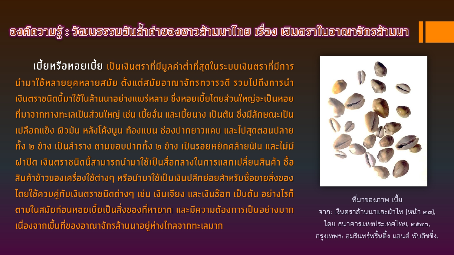 บุปผา คุณยศยิ่ง และศรีเลา เกษพรหม. "เงินตรา." สารานุกรมวัฒนธรรมไทย ภาคเหนือ. ๓. (๒๕๔๒): ๑๓๙๑-๑๓๙๖.