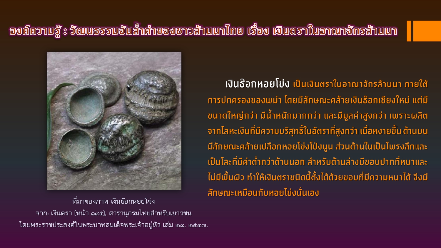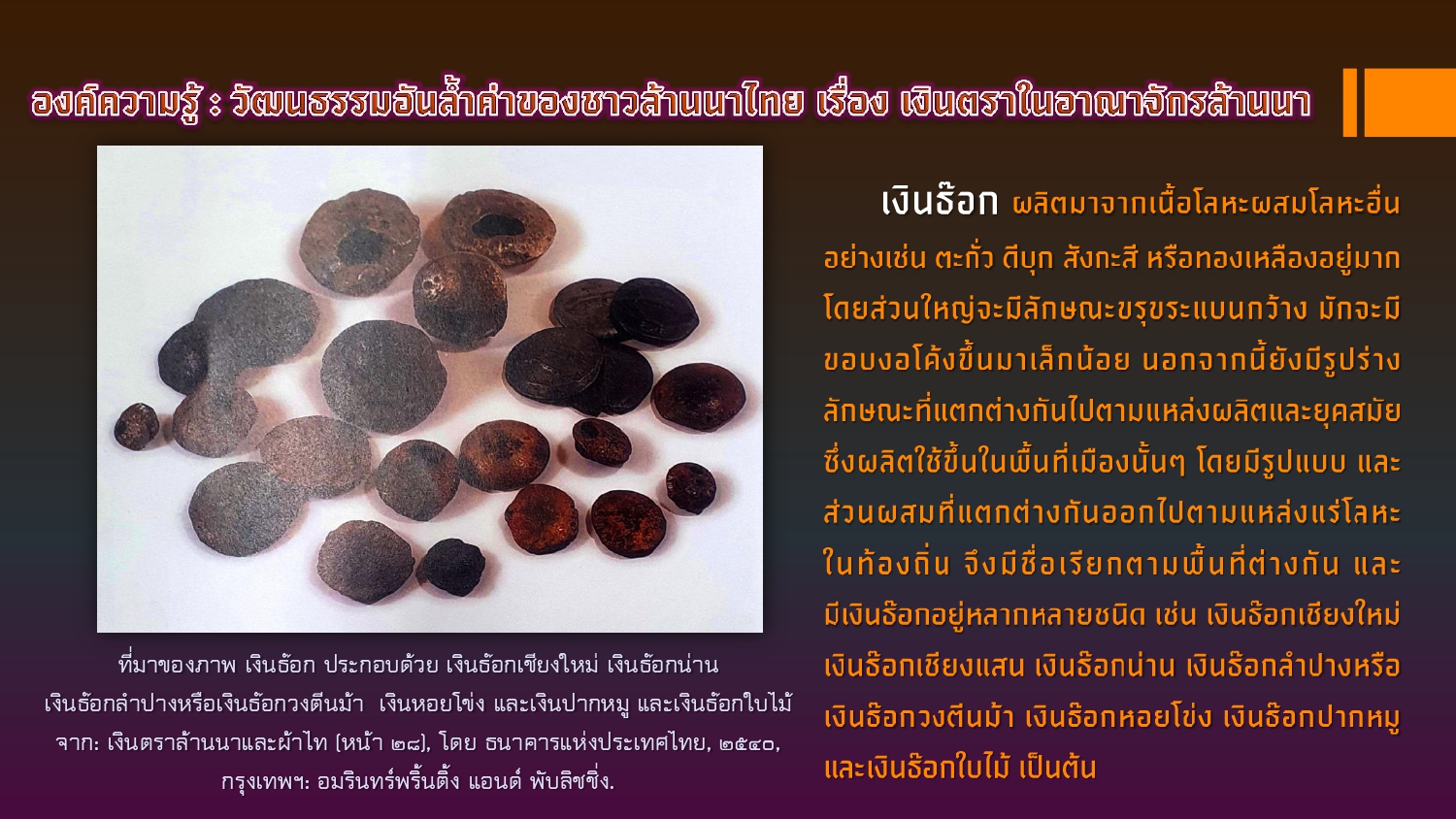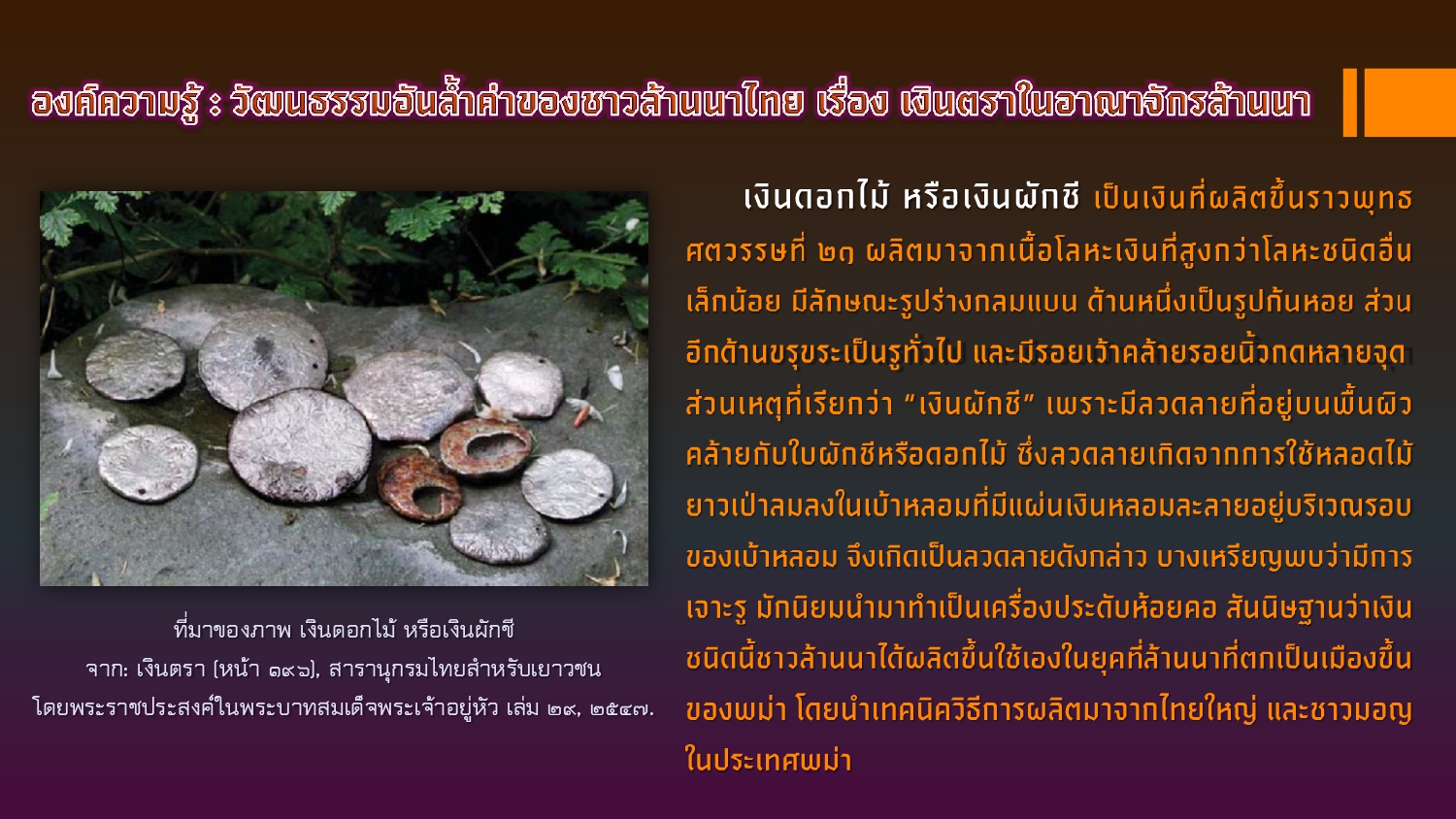 บุปผา คุณยศยิ่ง และศรีเลา เกษพรหม. "เงินตรา." สารานุกรมวัฒนธรรมไทย ภาคเหนือ. ๓. (๒๕๔๒): ๑๓๙๑-๑๓๙๖.
