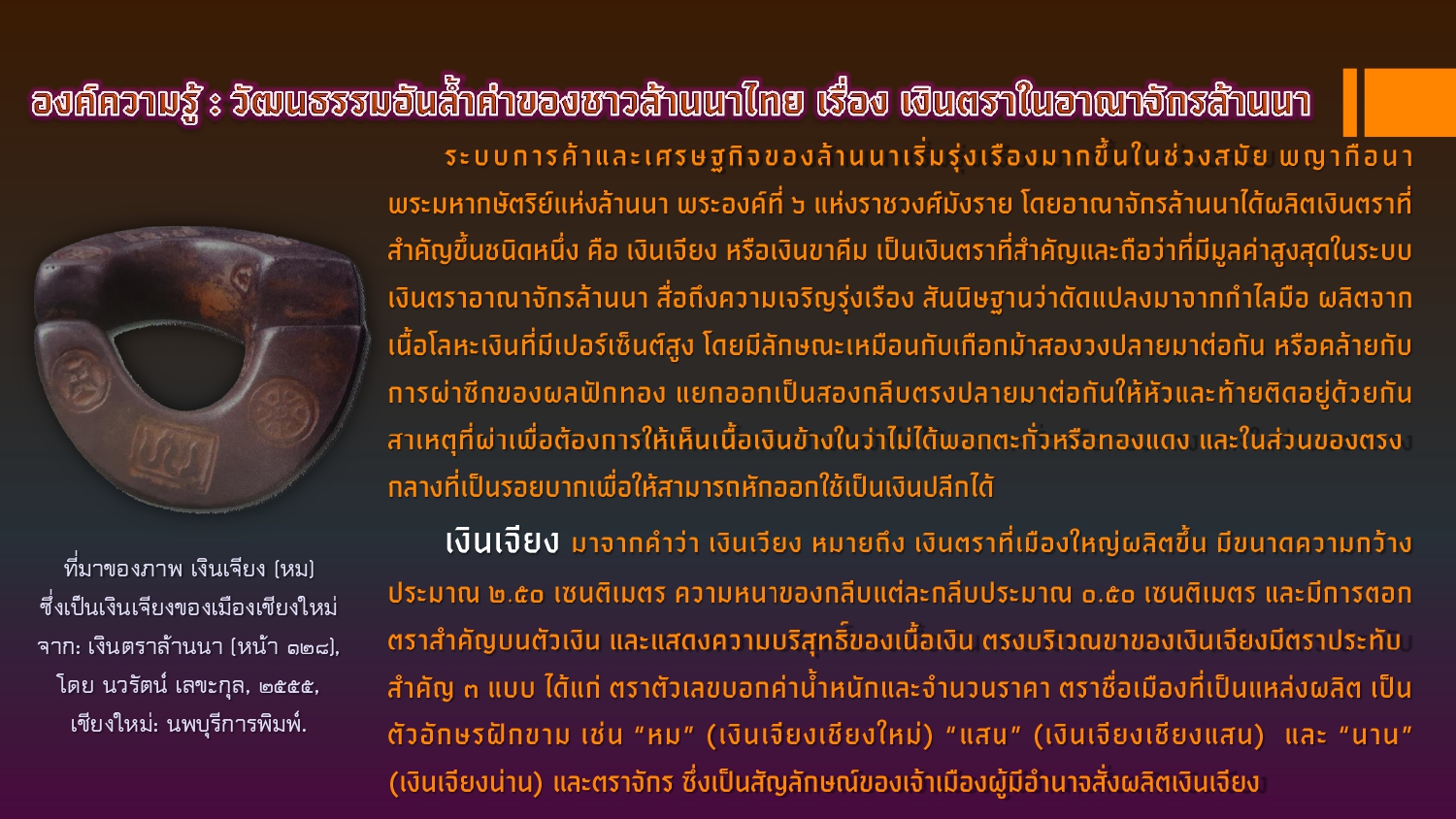 พิพิธภัณฑ์ธนารักษ์ จังหวัดเชียงใหม่. [ออนไลน์]. สืบค้นเมื่อ ๑๖ กันยายน ๒๕๖๘, จาก: https://emuseum-chiangmai.treasury.go.th/%20about-us