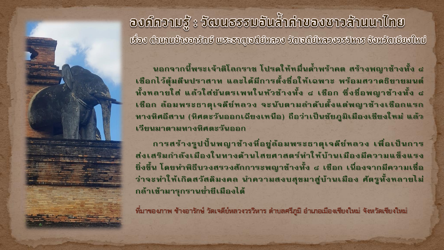 เรียบเรียงโดย : นายธีรบูลย์ มิตรมโนชัย นักวิชาการโสตทัศนศึกษาชำนาญการ หอสมุดแห่งชาติรัชมังคลาภิเษก เชียงใหม่ สำนักศิลปากรที่ ๗ เชียงใหม่ กรมศิลปากร กระทรวงวัฒนธรรม