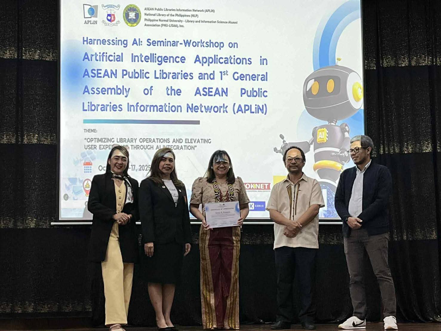 วันศุกร์ที่ ๑๗ ตุลาคม ๒๕๖๘ การประชุม 1ˢᵗ General Assembly of APLiN นางสาวปุณณภา สุขสาคร ผู้อำนวยการหอสมุดแห่งชาติรัชมังคลาภิเษก เชียงใหม่ และประธาน ASEAN Public Libraries Information Network (APLiN) กล่าวต้อนรับผู้เข้าร่วมงาน และได้รายงานผลการดำเนินงานของ APLiN ในช่วง ๓ ปีที่ผ่านมา (ค.ศ. ๒๐๒๓ - ๒๐๒๕) จากนั้นจึงได้มีพิธีปฏิญาณตนและส่งมอบตำแหน่งประธาน APLiN ค.ศ. ๒๐๒๖ - ๒๐๒๘ ให้กับ Mr. Chaerl Umam จาก National Library of Indonesia โดยผู้อำนวยการหอสมุดแห่งชาติรัชมังคลาภิเษก เชียงใหม่ ดำรงตำแหน่งที่ปรึกษาเครือข่ายห้องสมุด APLiN และนางวรรณภา ปะวิโน บรรณารักษ์ชำนาญการ ร่วมเป็นกรรมการกลางของ APLiN เป็นสมัยที่ ๒ หลังเสร็จสิ้นพิธี ได้เยี่ยมชม Children Library of National Library of the Philippines