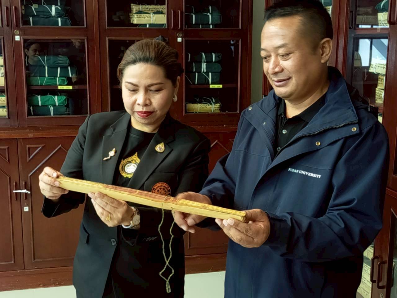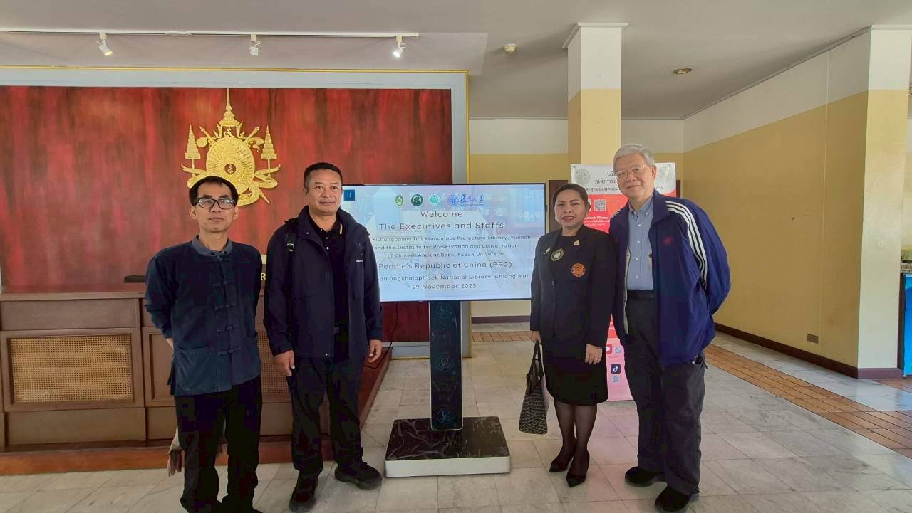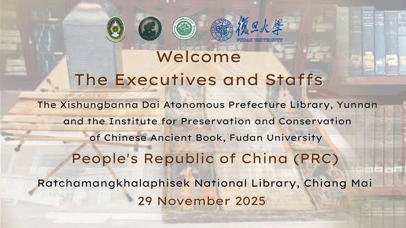 วันเสาร์ที่ ๒๙ พฤศจิกายน ๒๕๖๘ เวลา ๑๐.๐๐ - ๑๓.๐๐ น. คณะผู้บริหารและเจ้าหน้าที่ของหอสมุดแห่งชาติเขตปกครองตนเองชนชาติไท สิบสองพันนา มณฑลยูนนาน (Xishungbanna Dai Atonomous Prefecture Library, Yunnan) และ สถาบันอนุรักษ์หนังสือโบราณจีน มหาวิทยาลัยฟูตาน เมืองเซี่ยงไฮ้ (Institute for Preservation and Conservation of Chinese Ancient Books, Futan University) สาธารณรัฐประชาชนจีน จำนวน ๑๔ คน เยี่ยมชมและศึกษาดูงานเอกสารโบราณ หอสมุดแห่งชาติรัชมังคลาภิเษก เชียงใหม่ โดยมีนางสาวปุณณภา สุขสาคร ผู้อำนวยการหอสมุดแห่งชาติรัชมังคลาภิเษก เชียงใหม่ พร้อมด้วยบุคลากร ให้การต้อนรับ และร่วมพูดคุยหารือความร่วมมือด้านงานอนุรักษ์เอกสารโบราณ