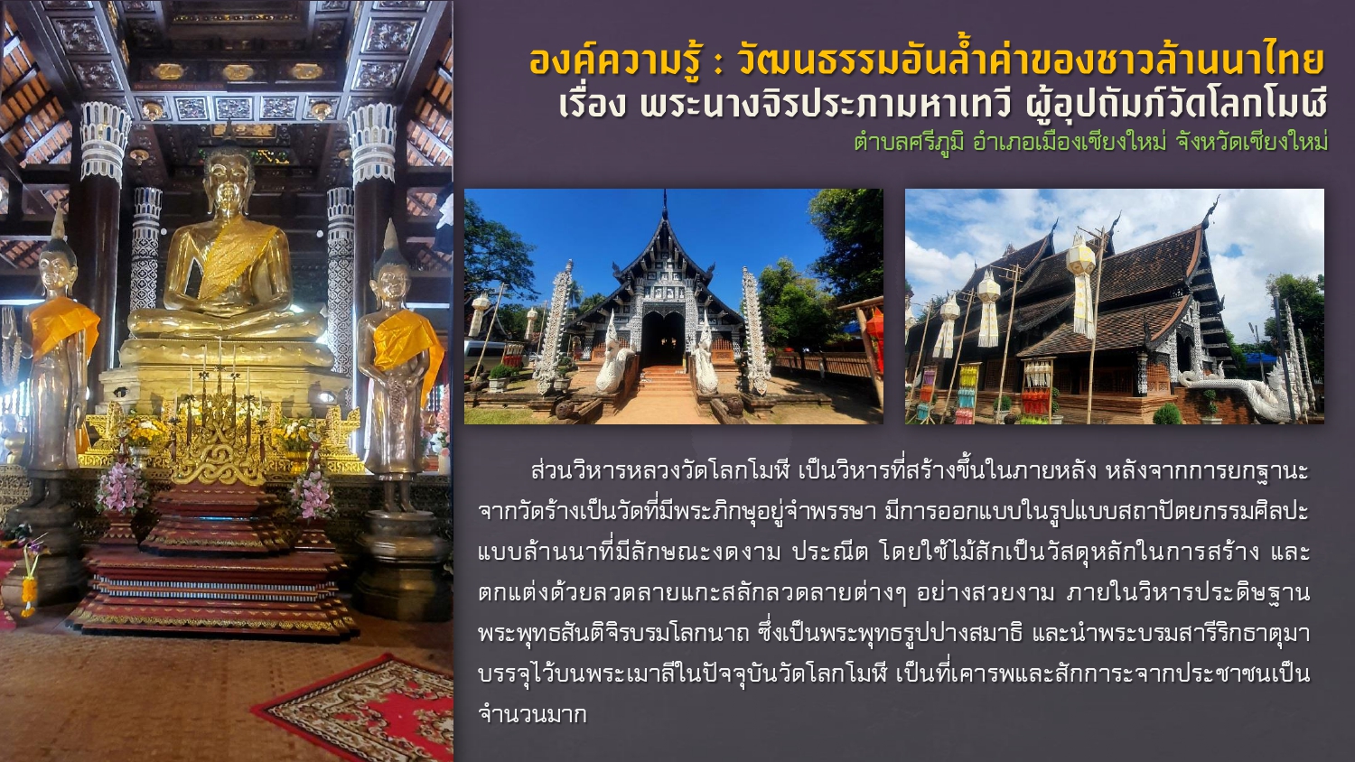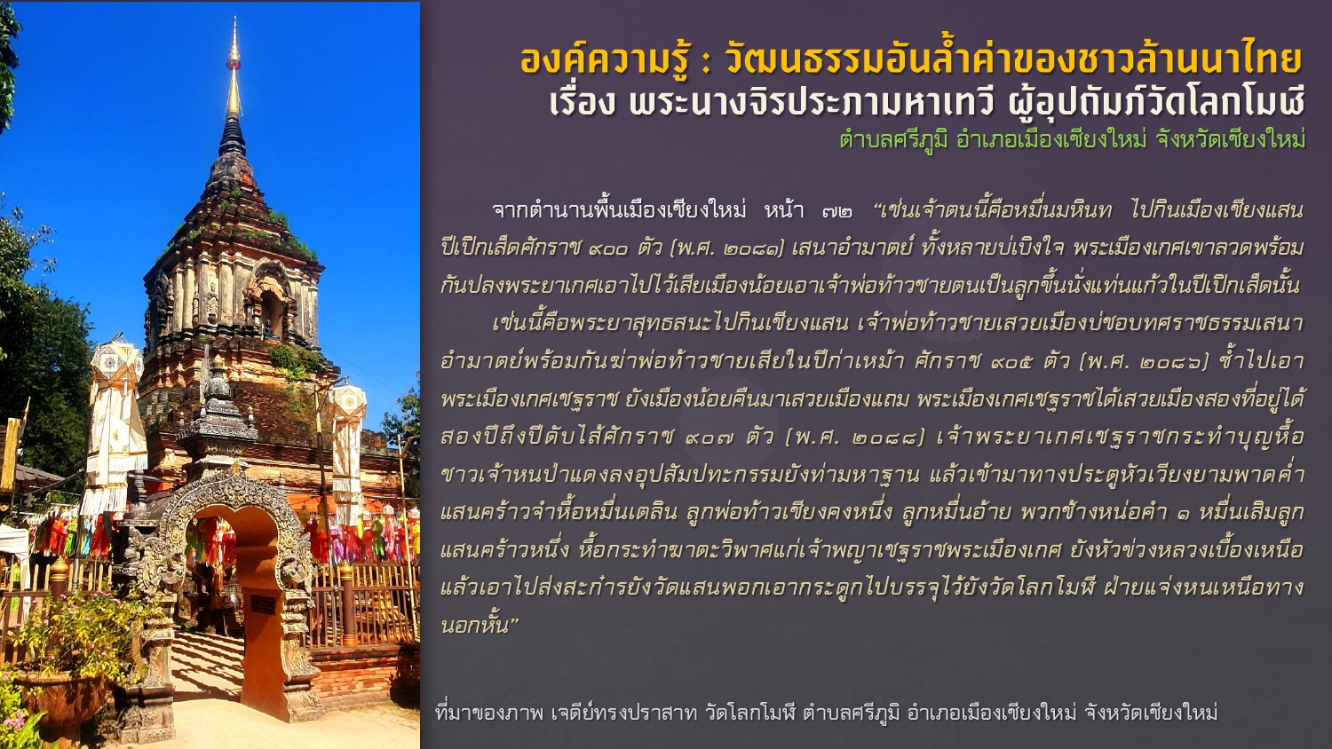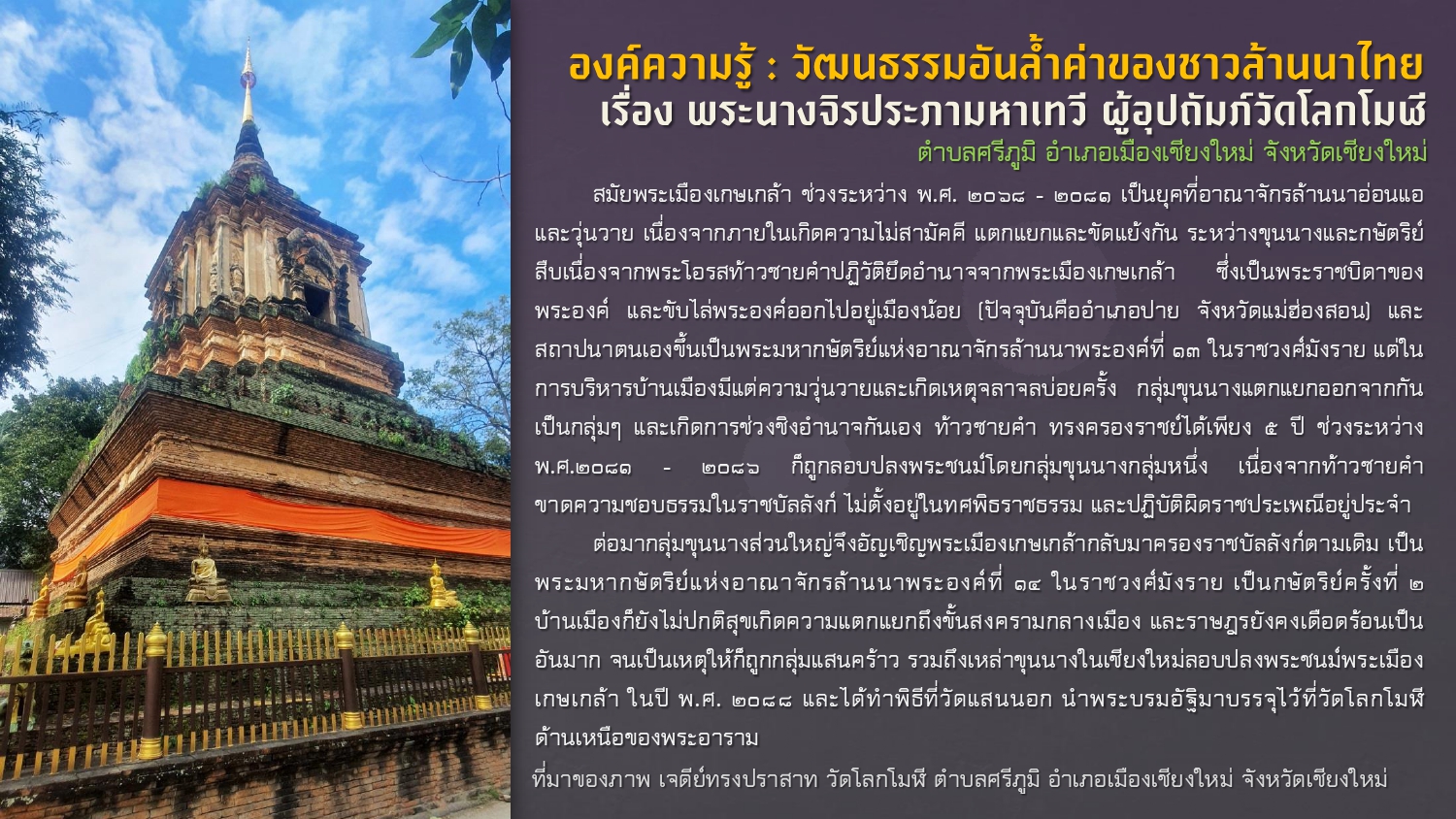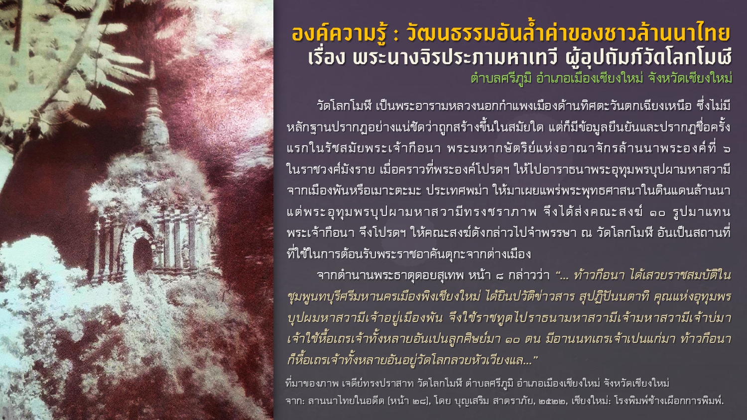 เรียบเรียงโดย : นายธีรบูลย์ มิตรมโนชัย นักวิชาการโสตทัศนศึกษาชำนาญการ หอสมุดแห่งชาติรัชมังคลาภิเษก เชียงใหม่ สำนักศิลปากรที่ ๗ เชียงใหม่ กรมศิลปากร กระทรวงวัฒนธรรม