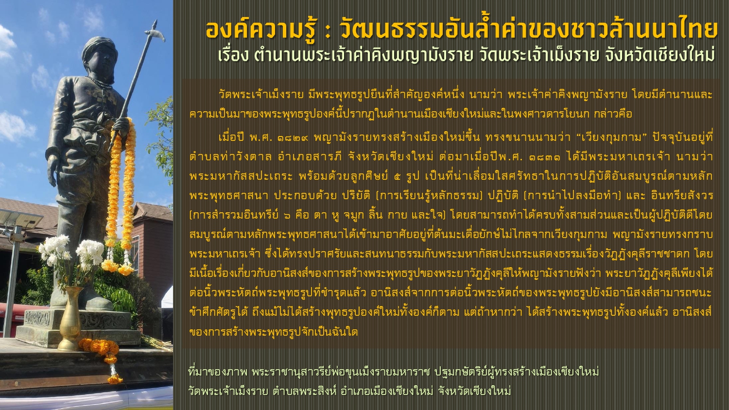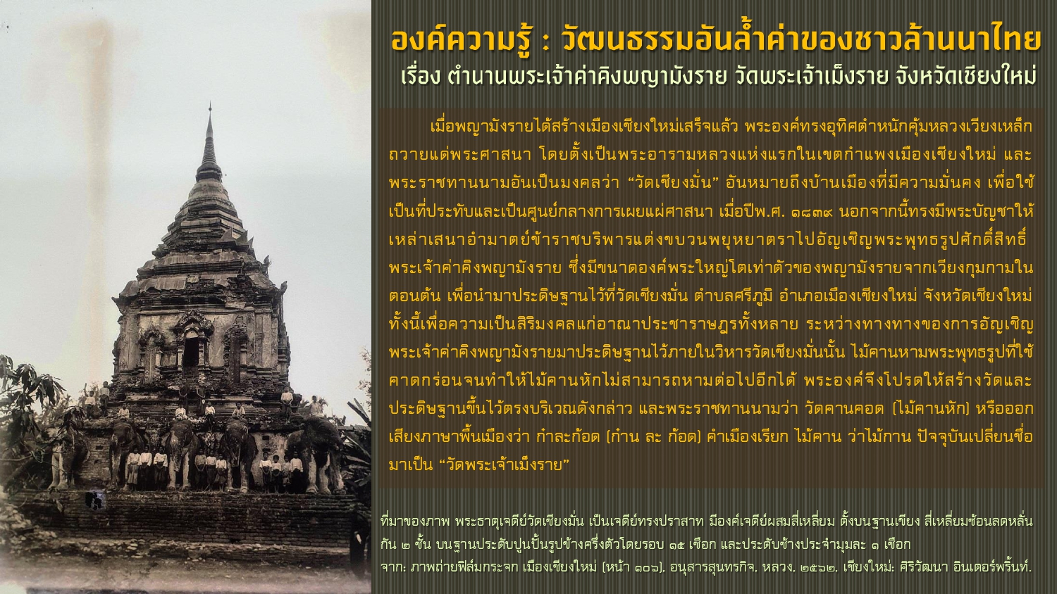 เรียบเรียงโดย : นายธีรบูลย์ มิตรมโนชัย นักวิชาการโสตทัศนศึกษาชำนาญการ หอสมุดแห่งชาติรัชมังคลาภิเษก เชียงใหม่ สำนักศิลปากรที่ ๗ เชียงใหม่ กรมศิลปากร กระทรวงวัฒนธรรม