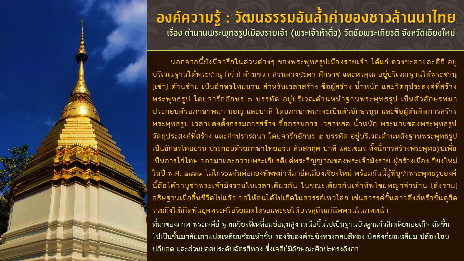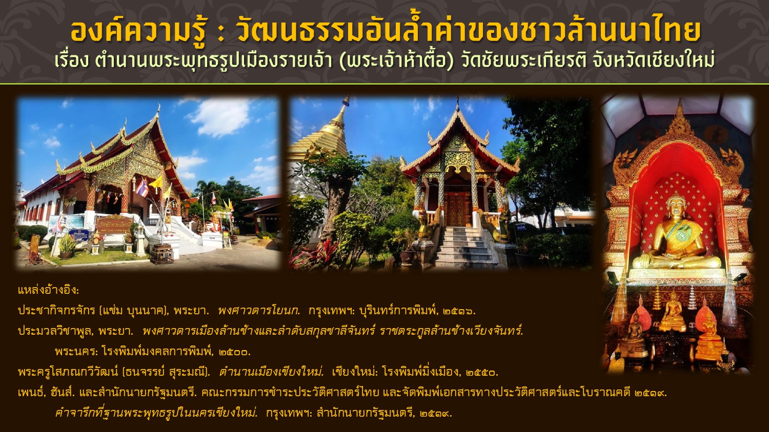 เรียบเรียงโดย : นายธีรบูลย์ มิตรมโนชัย นักวิชาการโสตทัศนศึกษาชำนาญการ หอสมุดแห่งชาติรัชมังคลาภิเษก เชียงใหม่ สำนักศิลปากรที่ ๗ เชียงใหม่ กรมศิลปากร กระทรวงวัฒนธรรม