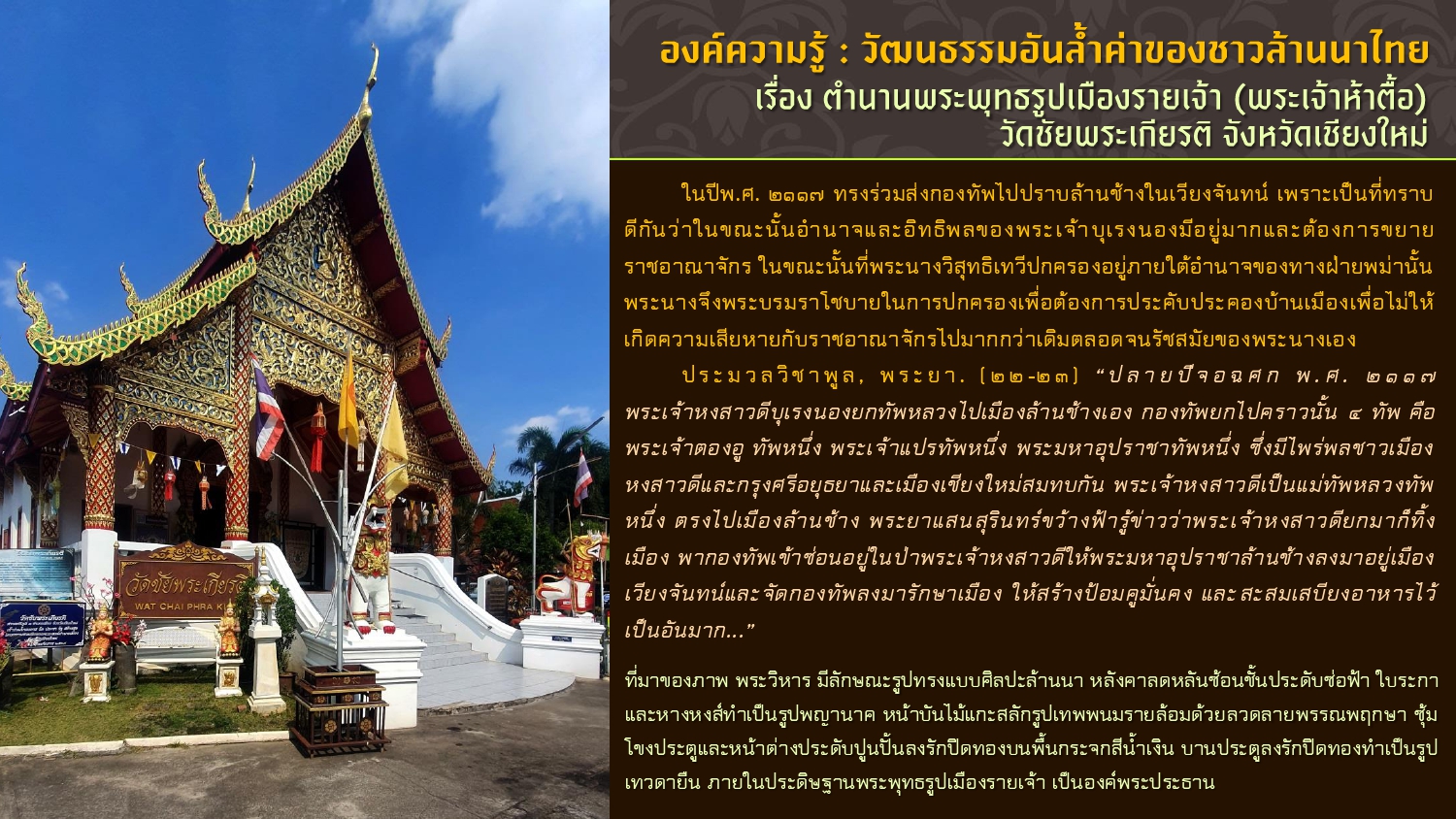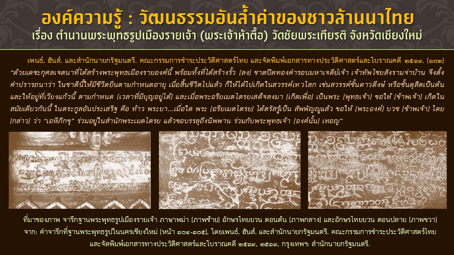 เรียบเรียงโดย : นายธีรบูลย์ มิตรมโนชัย นักวิชาการโสตทัศนศึกษาชำนาญการ หอสมุดแห่งชาติรัชมังคลาภิเษก เชียงใหม่ สำนักศิลปากรที่ ๗ เชียงใหม่ กรมศิลปากร กระทรวงวัฒนธรรม