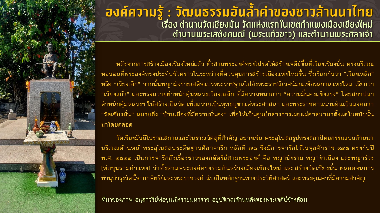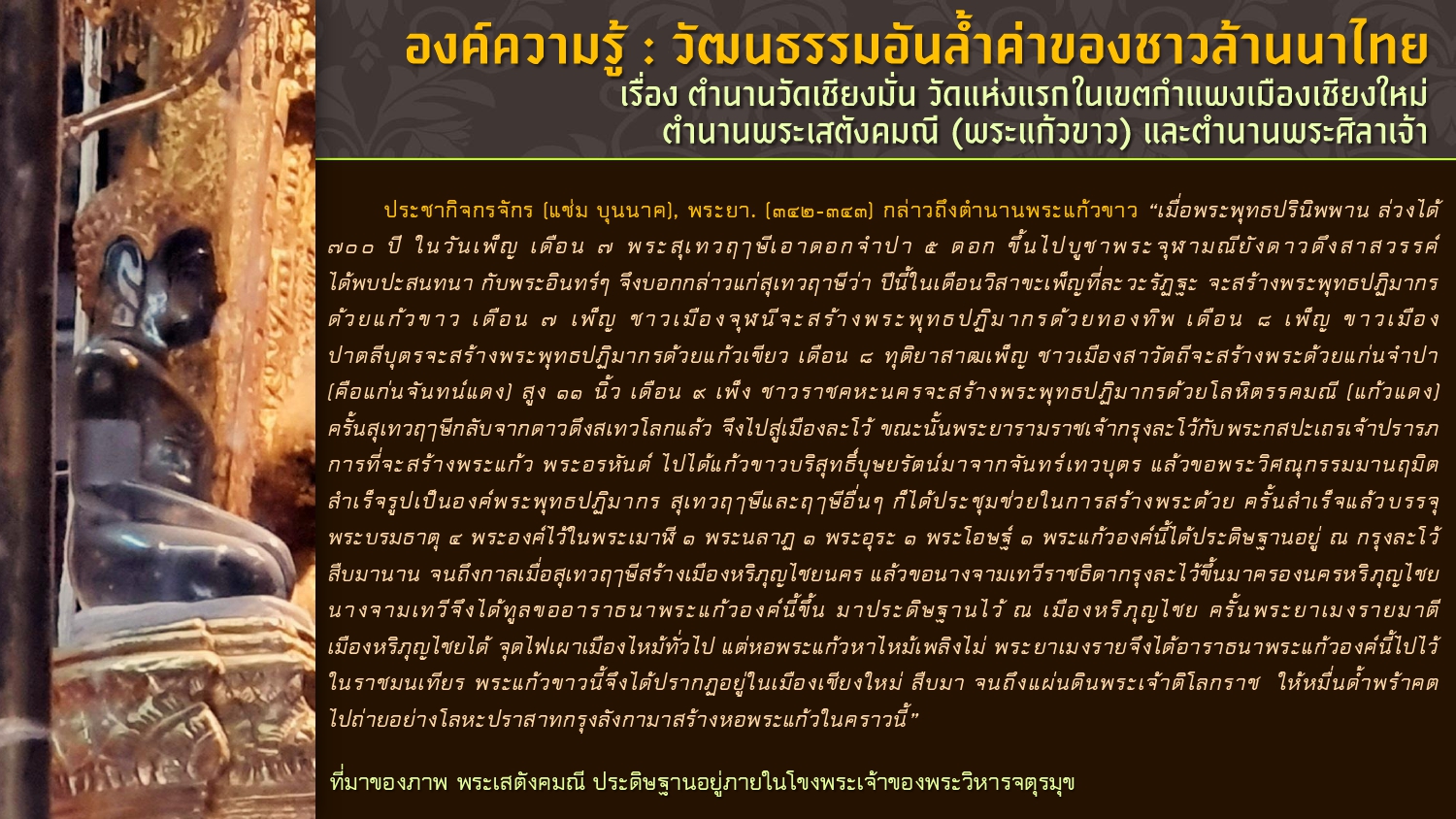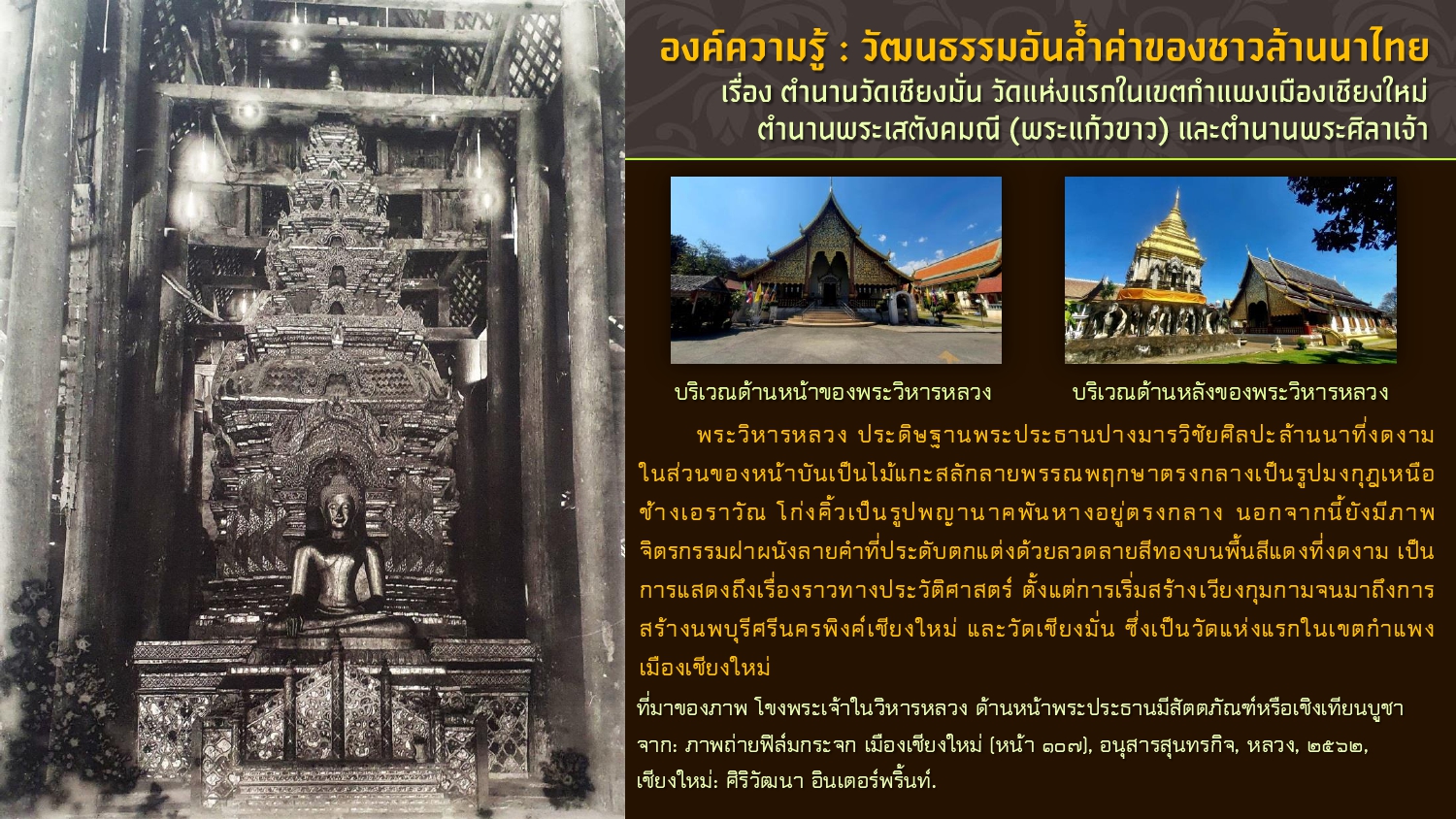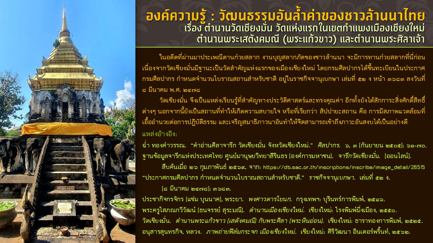 เรียบเรียงโดย : นายธีรบูลย์ มิตรมโนชัย นักวิชาการโสตทัศนศึกษาชำนาญการ หอสมุดแห่งชาติรัชมังคลาภิเษก เชียงใหม่ สำนักศิลปากรที่ ๗ เชียงใหม่ กรมศิลปากร กระทรวงวัฒนธรรม