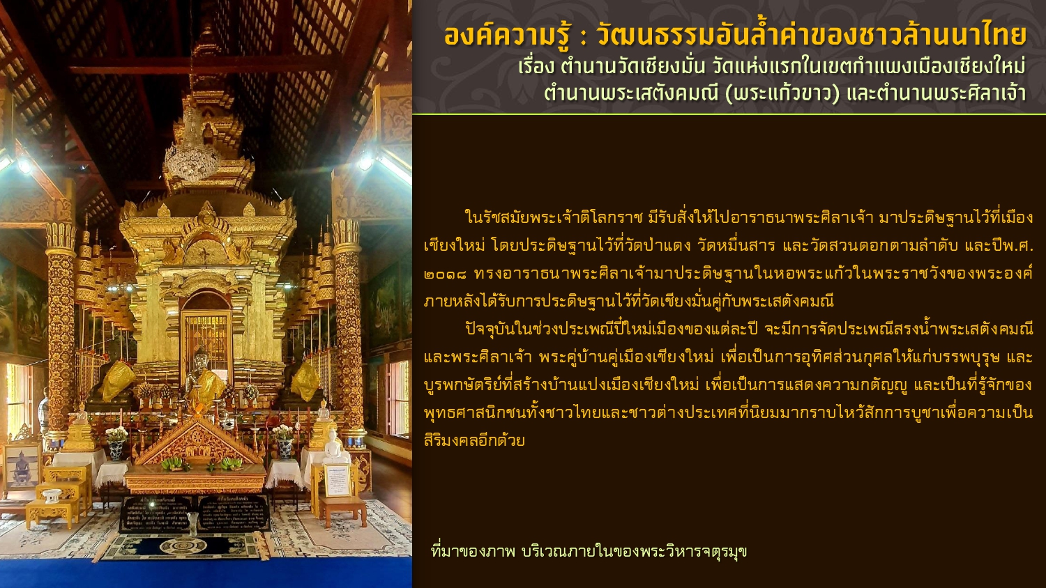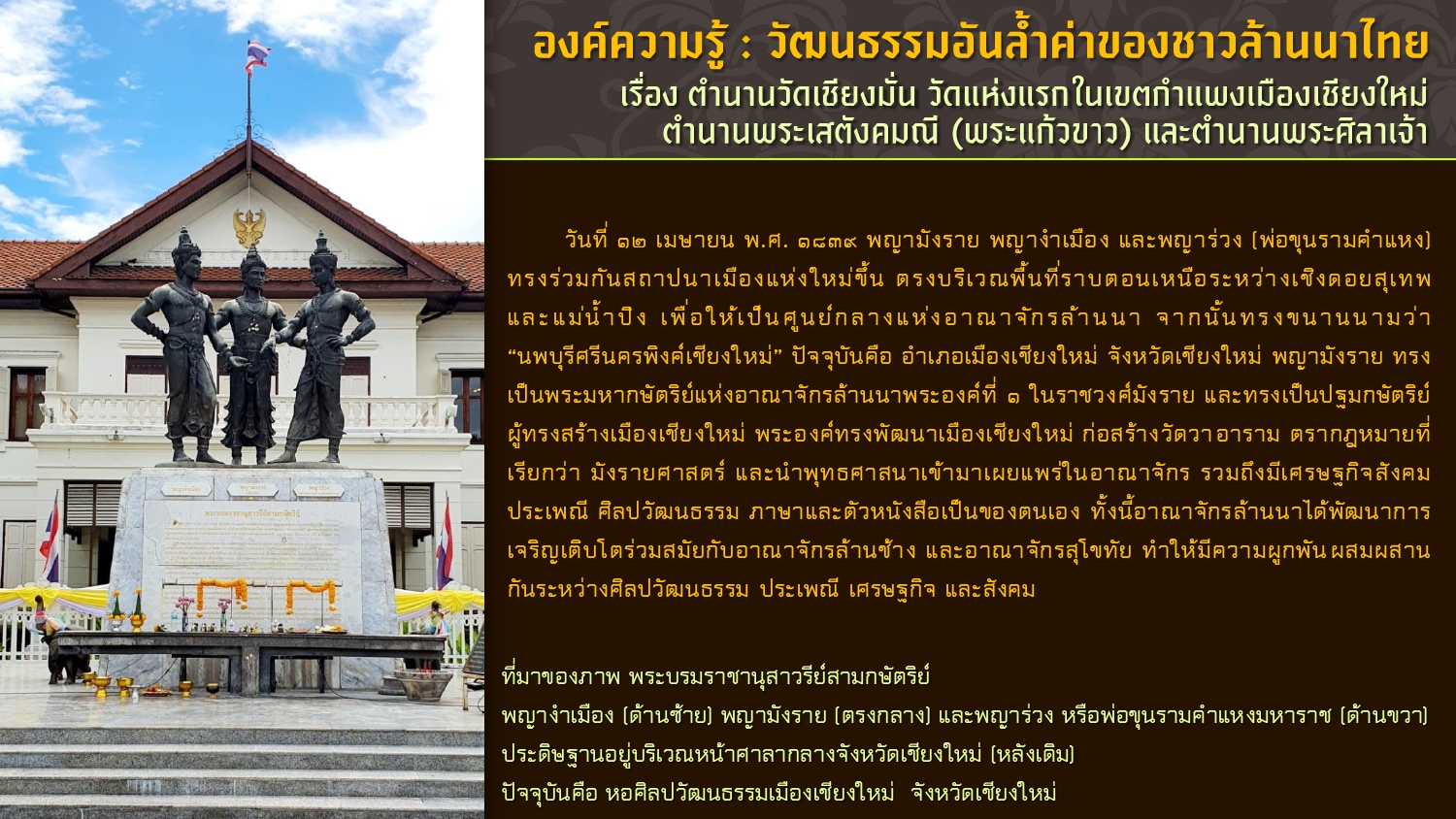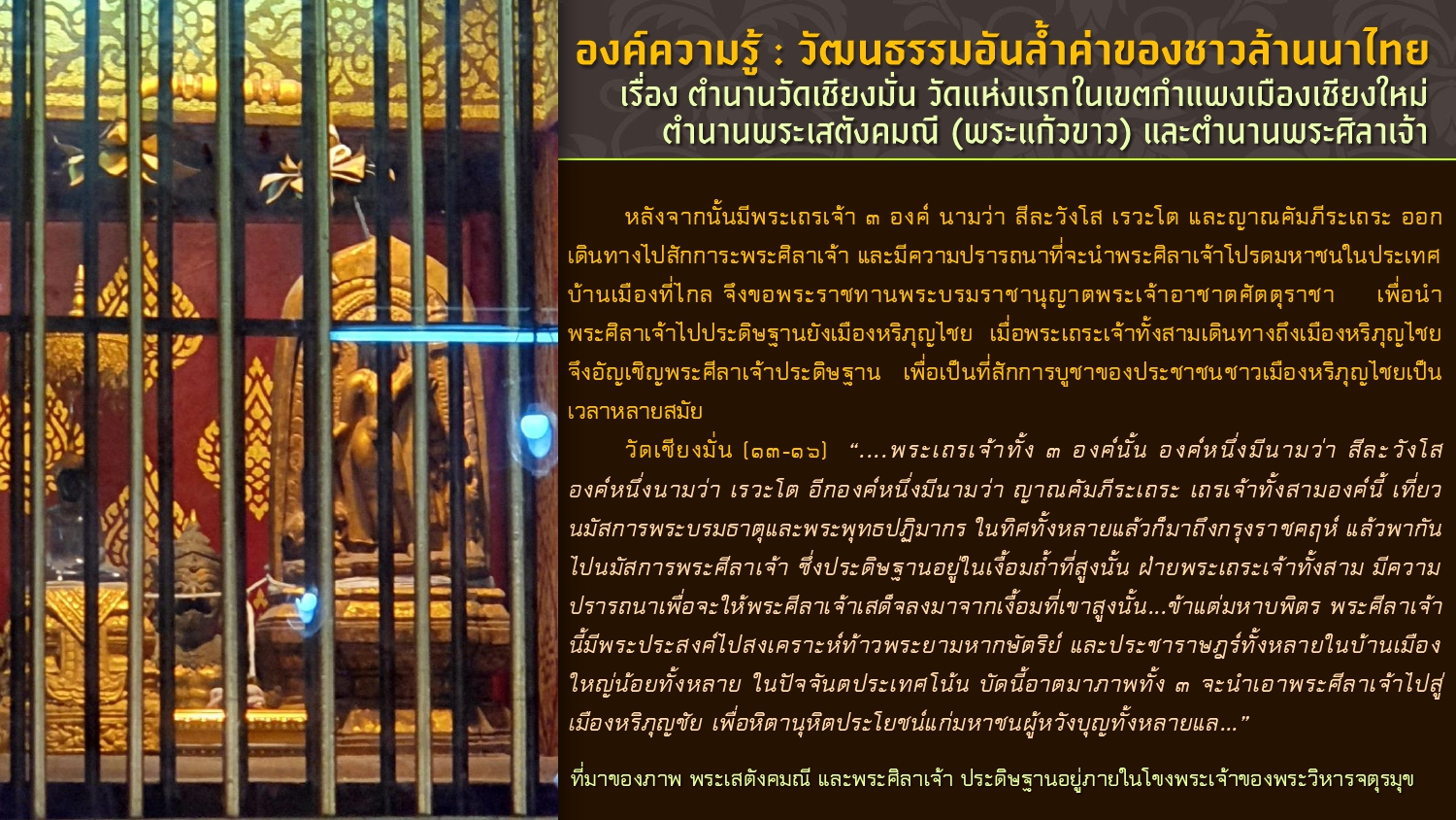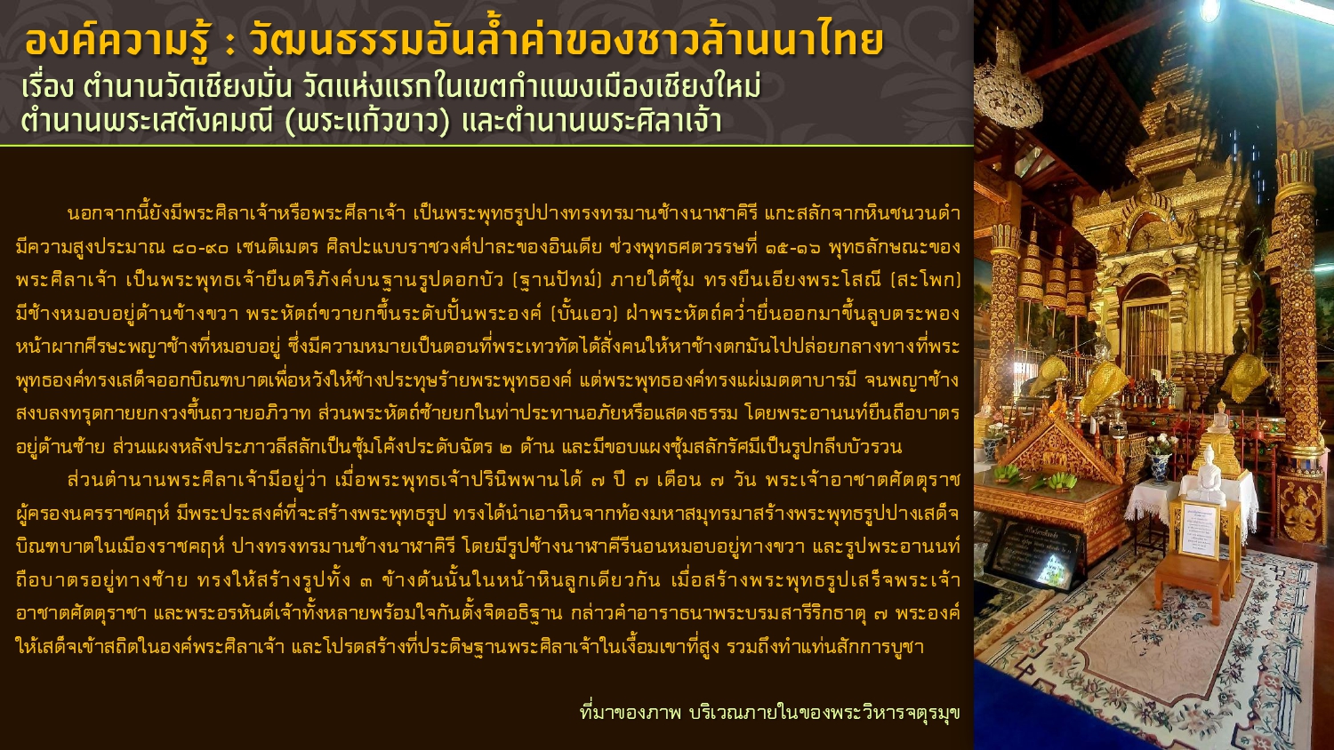 เรียบเรียงโดย : นายธีรบูลย์ มิตรมโนชัย นักวิชาการโสตทัศนศึกษาชำนาญการ หอสมุดแห่งชาติรัชมังคลาภิเษก เชียงใหม่ สำนักศิลปากรที่ ๗ เชียงใหม่ กรมศิลปากร กระทรวงวัฒนธรรม