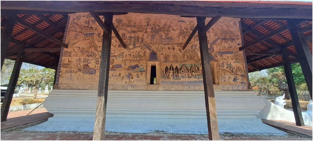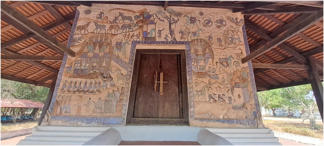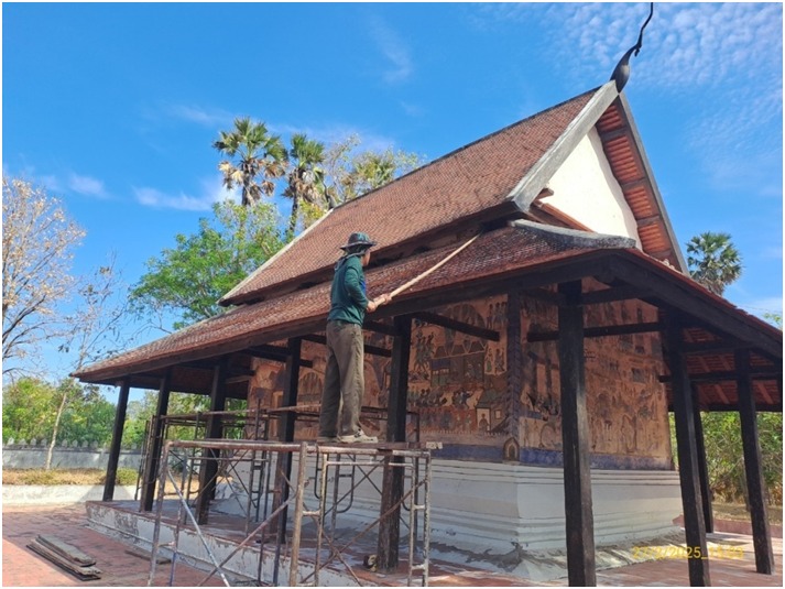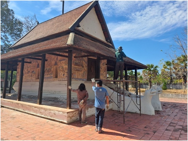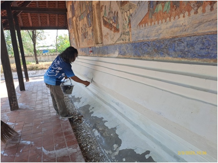 ดำเนินงานทำความสะอาดและกำจัดสิ่งปฏิกูลบนภาพจิตรกรรมฝาผนังภายในและภายนอก อุโบสถวัดป่าเรไร ตำบลดงบัง อำเภอนาดูน จังหวัดมหาสารคาม