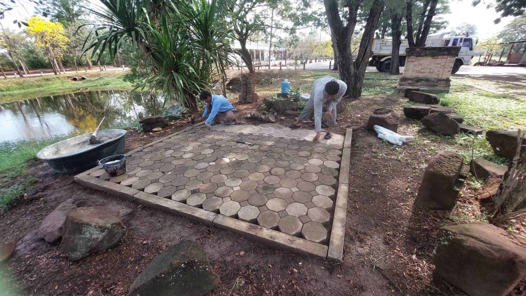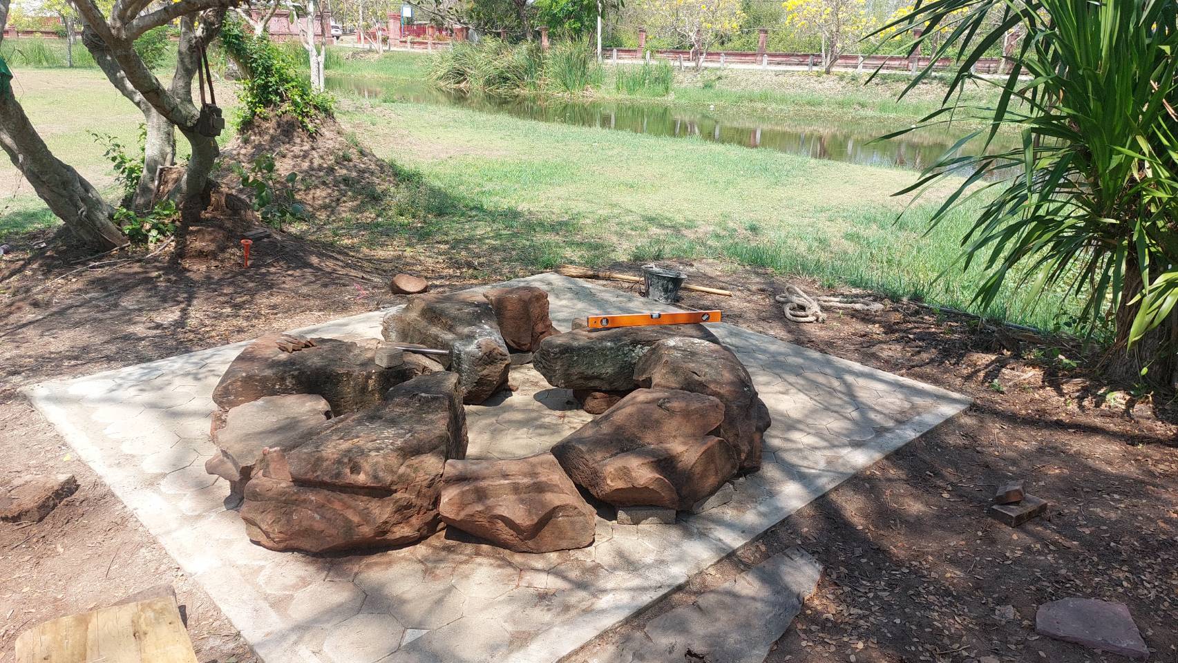 ดำเนินการทดลองประกอบหินพร้อมทั้งปรับพื้นที่เพื่อทำลานจัดแสดง ปูอิฐตัวบล็อกหกเหลี่ยม และขนย้ายทดลองประกอบบัวยอด ณ โบราณสถานปรางค์บ้านปรางค์ อำเภอคง จังหวัดนครราชสีมา