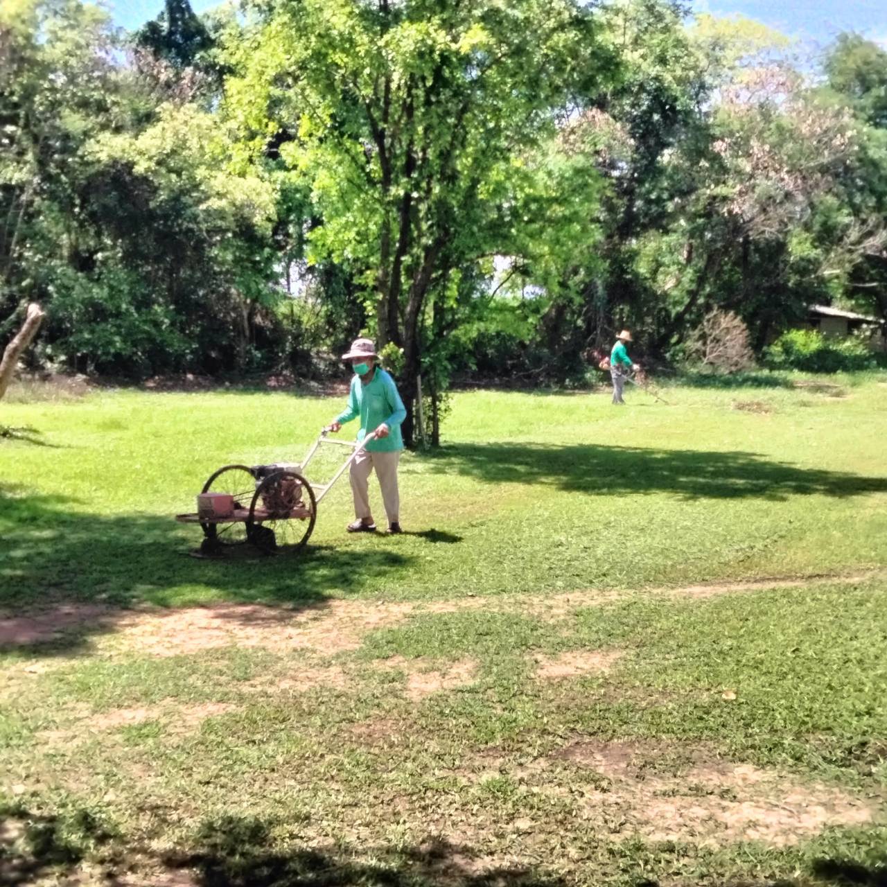 การดำเนินงานถากถางกำจัดวัชพืชและทำความสะอาดพื้นที่โดยรอบโบราณสถานปราสาทเมืองเก่า ตำบลโคราช อำเภอสูงเนิน จังหวัดนครราชสีมา ในวันพุธที่ 14 พฤษภาคม 2568