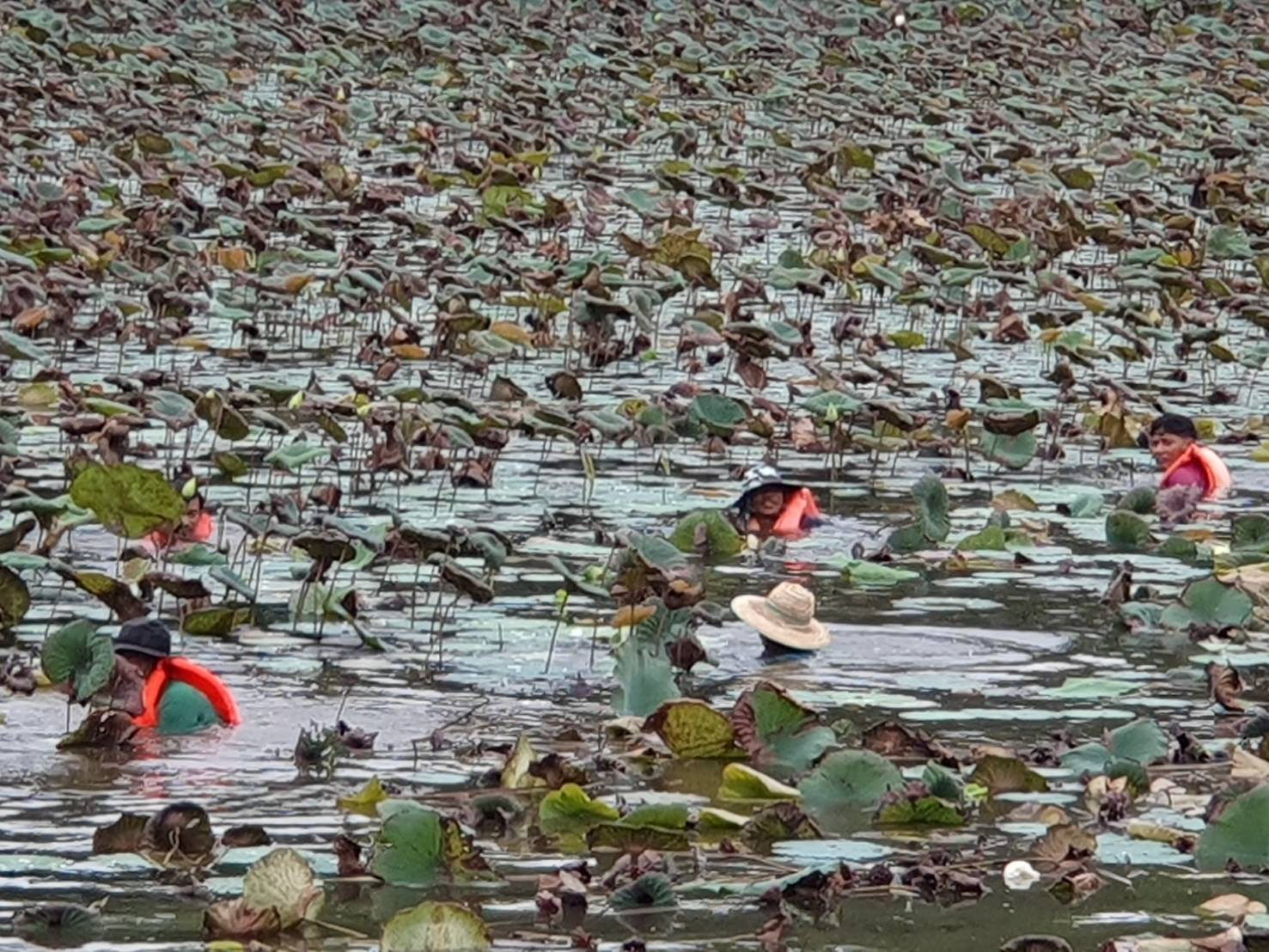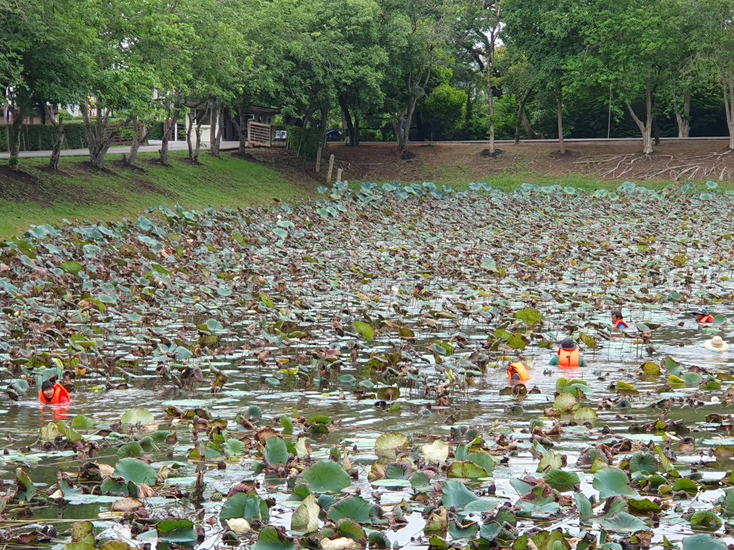 เจ้าหน้าที่ดำเนินการกำจัดวัชพืชภายในสระน้ำโบราณ (สระช่องแมว) บริเวณพื้นที่อาคารสำนักงาน สำนักศิลปากรที่ ๑๐ นครราชสีมา ในวันศุกร์ที่ ๓๐ พฤษภาคม ๒๕๖๘