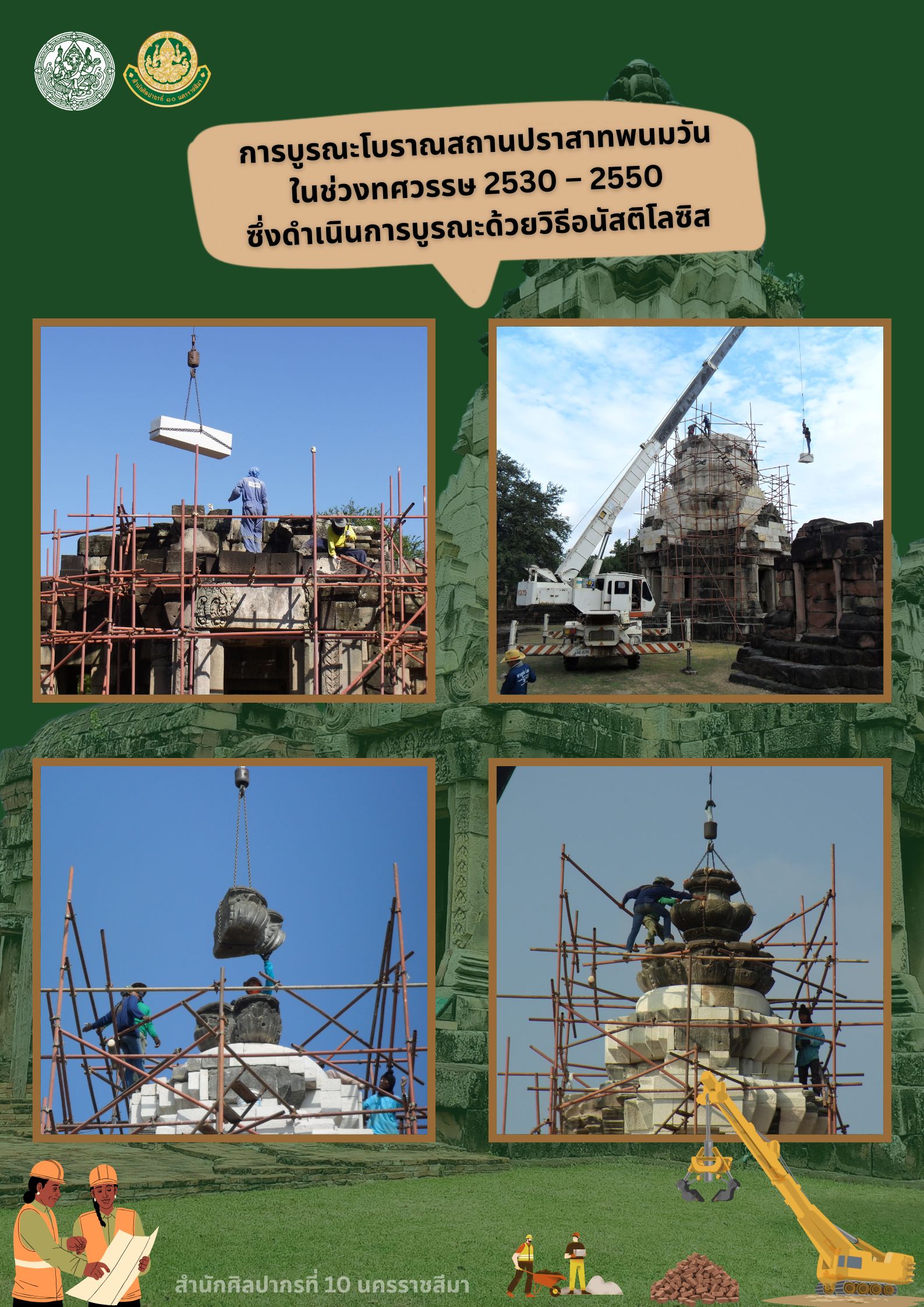 บรรยากาศการบูรณะโบราณสถานปราสาทพนมวัน ตำบลบ้านโพธิ์ อำเภอเมือง จังหวัดนครราชสีมา ในช่วงทศวรรษ 2530 – 2550 ซึ่งดำเนินการบูรณะด้วยวิธีอนัสติโลซิส ที่กรมศิลปากรควบคุม กำกับ ดูแล อีกทั้งปราสาทพนมวันแห่งนี้ ยังเป็นโรงเรียนสำหรับการบูรณะโบราณสถานประเภทหินของข้าราชการ เจ้าหน้าที่ของกรมศิลปากรอีกด้วย