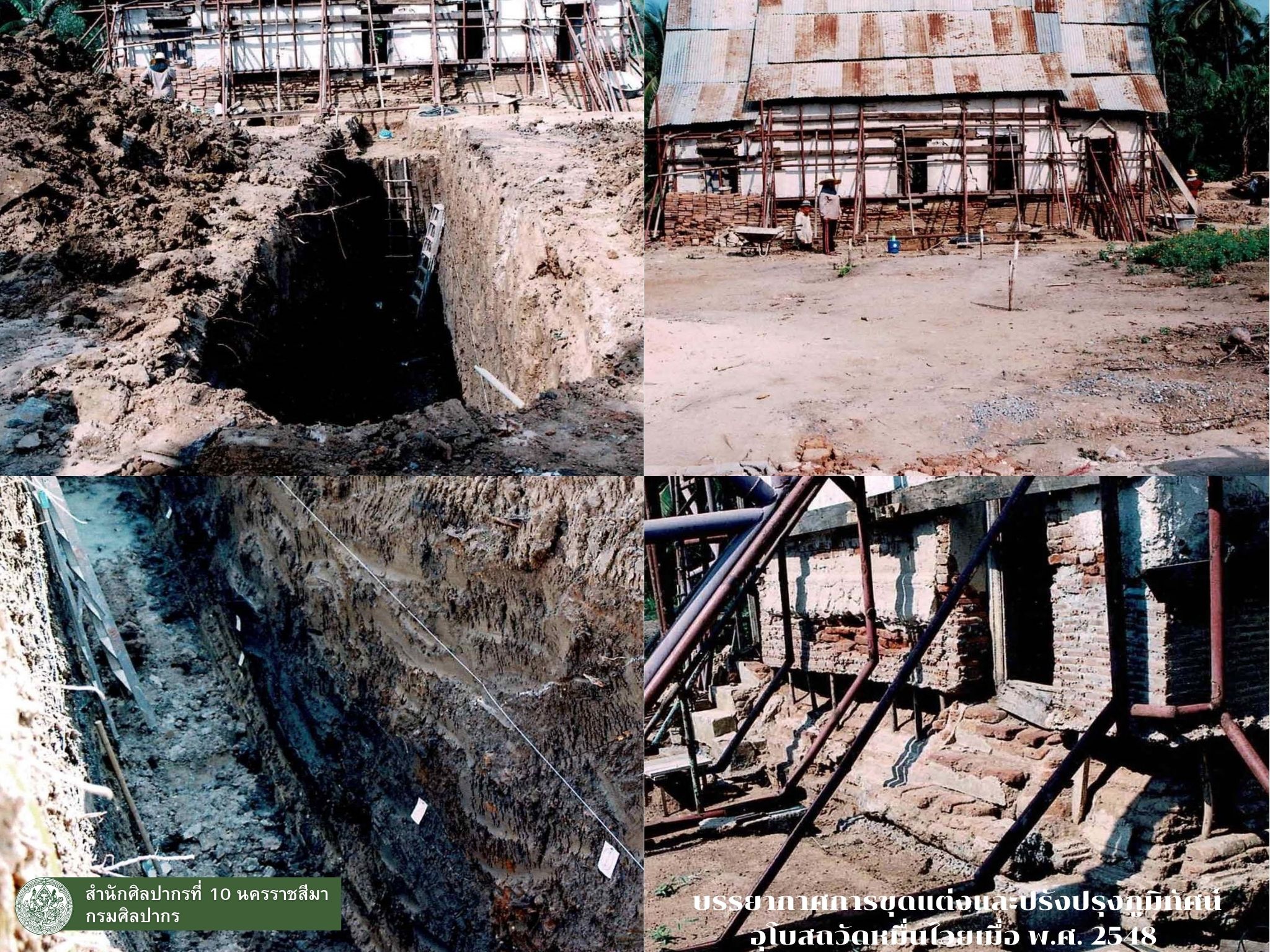 สภาพอุโบสถในปัจจุบันพบว่าส่วนฐานค่อนข้างเสื่อมสภาพ จากความชื้นและความเค็มใต้ผิวดิน คงเหลือหลักฐานปูนฉาบเป็นรูปทรงและลวดลาย โดยผลจากการขุดแต่งโบราณสถานเมื่อ พ.ศ. 2548 พบว่าส่วนฐานเป็นฐานบัวลูกแก้วอกไก่ มีลักษณะโค้งลงตรงกลางหรือที่เรียกว่า ลักษณะหย่อนท้องสําเภา ขนาดสูง 0.90 เมตร ลักษณะสําคัญอีกประการหนึ่งที่พบบริเวณส่วนฐาน คือ การก่ออิฐและฉาบปูนเพิ่มเนื้อที่ แนวขนานที่กลางด้านเหนือและใต้ของฐานอุโบสถ