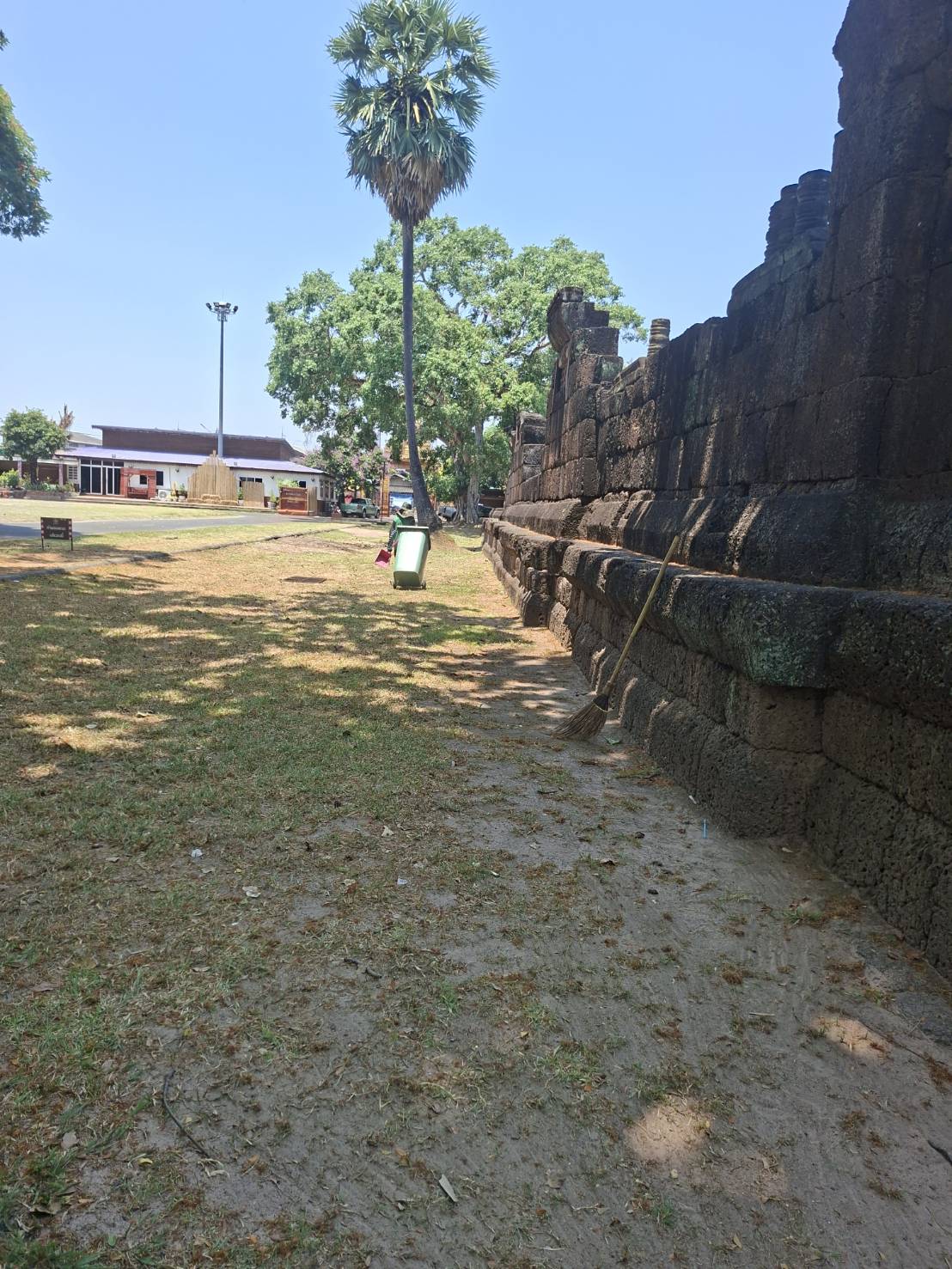 การดำเนินงานถากถางกำจัดวัชพืชบริเวณโดยรอบโบราณสถานปราสาทสระกำแพงใหญ่ ตำบลสระกำแพงใหญ่ อำเภออุทุมพรพิสัย จังหวัดศรีสะเกษ ในวันอาทิตย์ที่ 12 เมษายน 2569