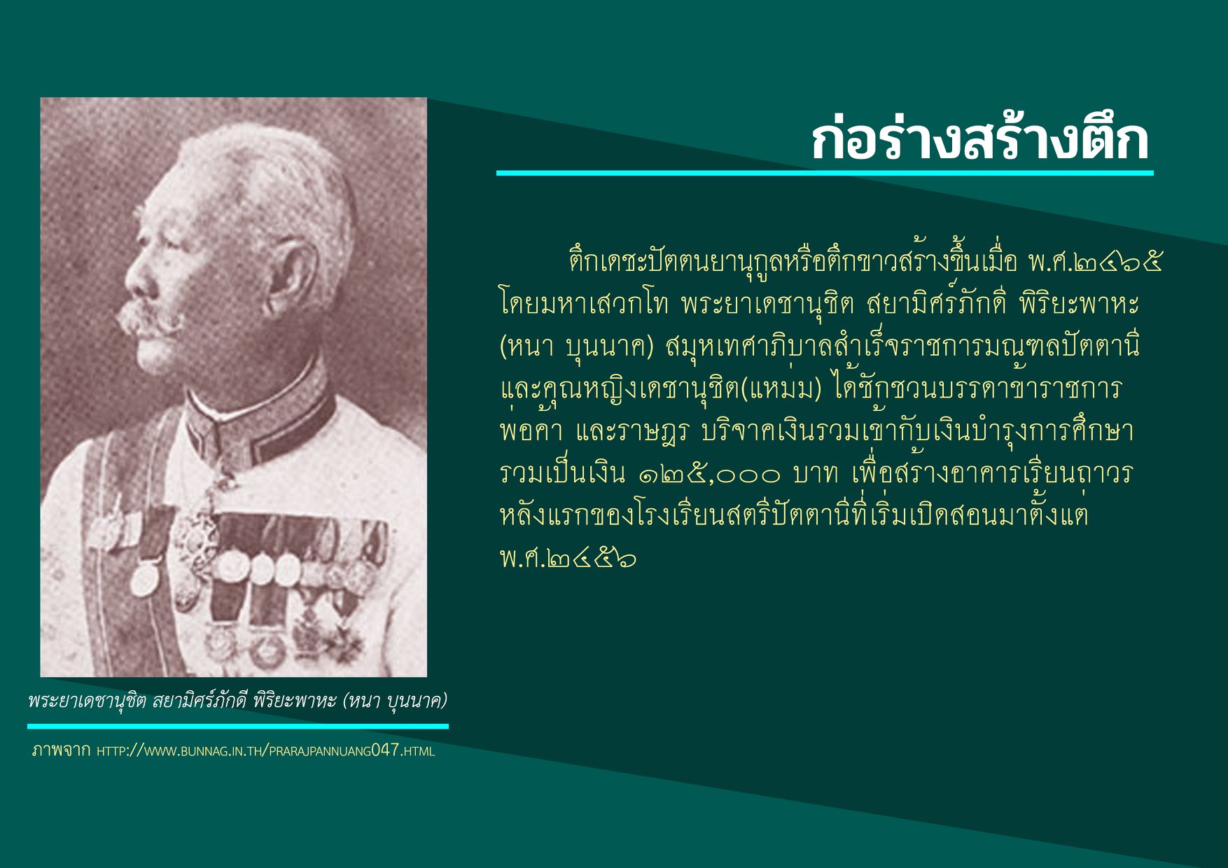 ตึกเดชะปัตตนยานุกูลหรือตึกขาวสร้างขึ้นเมื่อพ.ศ. ๒๔๖๕ โดยมหาเสวกโทพระยาเดชานุชิต สยามิศร์ภักดีพิริยะพาหะ (หนา บุนนาค) สมุหเทศาภิบาลสำเร็จราชการมณฑลปัตตานี และคุณหญิงเดชานุชิต(แหม่ม) ได้ชักชวนบรรดาข้าราชการ พ่อค้า และราษฎร บริจาคเงินรวมเข้ากับเงินบำรุงการศึกษารวมเป็นเงิน ๑๒๕,๐๐๐ บาท เพื่อสร้างอาคารเรียนถาวรหลังแรกของโรงเรียนสตรีปัตตานีที่เริ่มเปิดสอนมาตั้งแต่ พ.ศ.๒๔๕๖