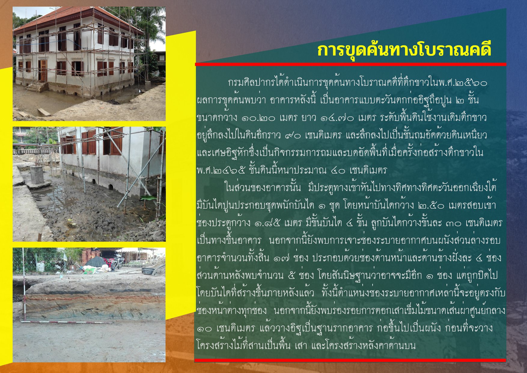 กรมศิลปากรได้ดำเนินการขุดค้นทางโบราณคดีที่ตึกขาวในพ.ศ.๒๕๖๐ ผลการขุดค้นพบว่า อาคารหลังนี้ เป็นอาคารแบบตะวันตกก่ออิฐถือปูน ๒ ชั้น ขนาดกว้าง ๑๐.๒๐ เมตร ยาว ๑๔.๗๐ เมตร ระดับพื้นดินใช้งานเดิมตึกขาวอยู่ลึกลงไปในดินอีกราว ๙๐ เซนติเมตร และลึกลงไปเป็นชั้นถมอัดด้วยดินเหนียวและเศษอิฐหักซึ่งเป็นกิจกรรมการถมและบดอัดพื้นที่เมื่อครั้งก่อสร้างตึกขาว