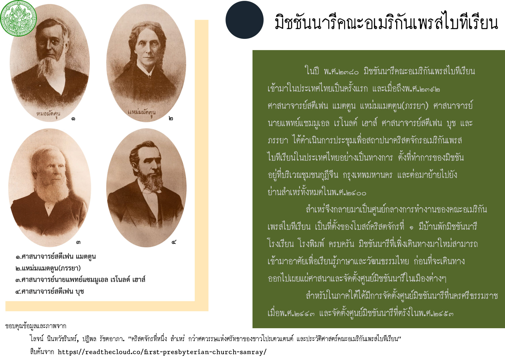ในปี พ.ศ.๒๓๘๐ มิชชันนารีคณะอเมริกันเพรสไบทีเรียนเข้ามาในประเทศไทยเป็นครั้งแรก และเมื่อถึงพ.ศ.๒๓๙๒ ศาสนาจารย์สตีเฟน แมตตูน แหม่มแมตตูน(ภรรยา) ศาสนาจารย์นายแพทย์แซมมูเอล เรโนลด์ เฮาส์ ศาสนาจารย์สตีเฟน บุช และภรรยา ได้ดำเนินการประชุมเพื่อสถาปนาคริสตจักรอเมริกันเพรสไบทีเรียนในประเทศไทยอย่างเป็นทางการ ตั้งที่ทำการของมิชชันอยู่ที่บริเวณชุมชนกุฎีจีน กรุงเทพมหานคร และต่อมาย้ายไปยังย่านสำเหร่ทั้งหมดในพ.ศ.๒๔๐๐