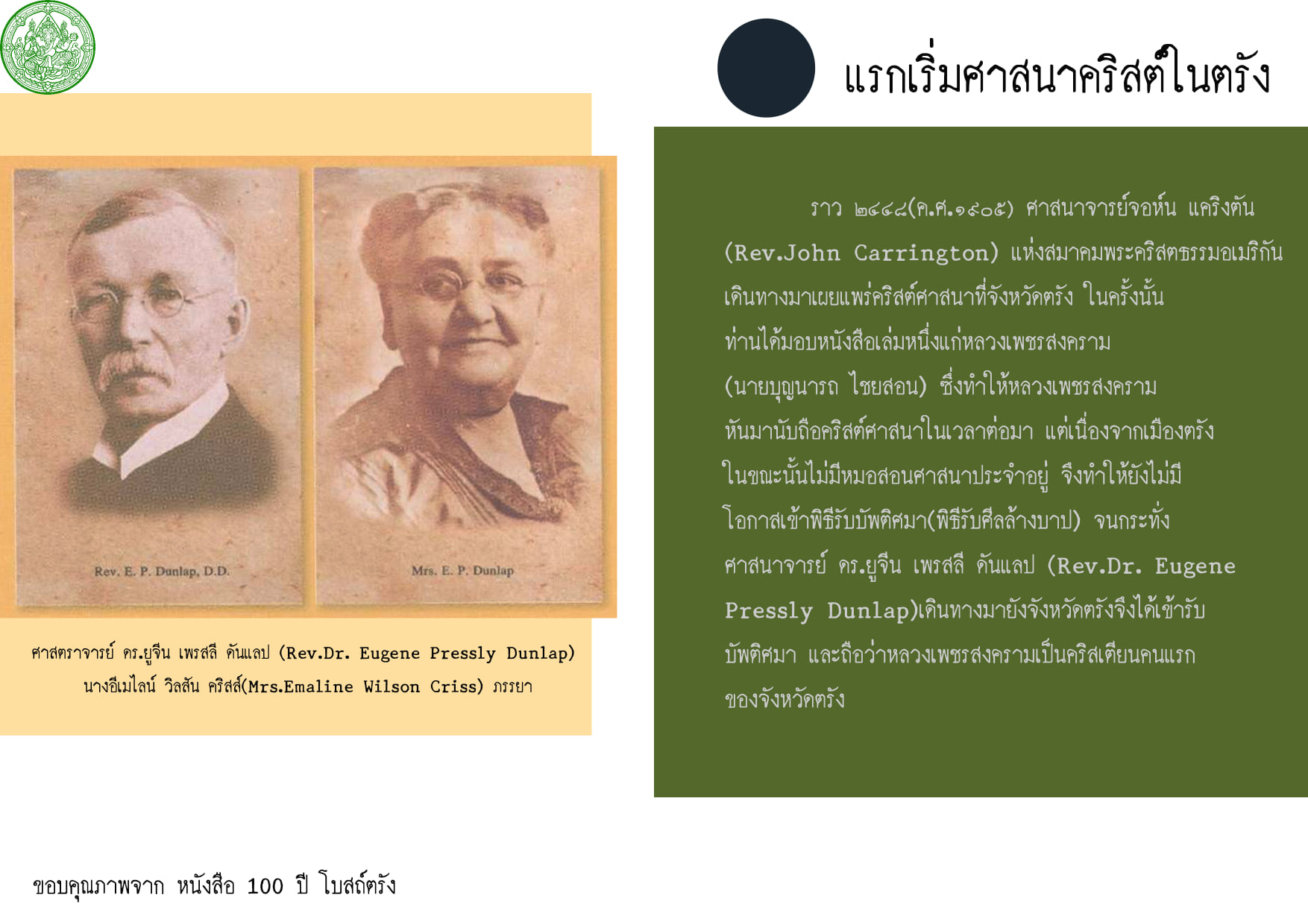 ราว ๒๔๔๘(ค.ศ.๑๙๐๕) ศาสนาจารย์จอห์น แคริงตัน(Rev.John Carrington) แห่งสมาคมพระคริสตธรรมอเมริกันเดินทางมาเผยแพร่คริสต์ศาสนาที่จังหวัดตรัง ในครั้งนั้นท่านได้มอบหนังสือเล่มหนึ่งแก่หลวงเพชรสงคราม (นายบุญนารถ ไชยสอน) ซึ่งทำให้หลวงเพชรสงครามหันมานับถือคริสต์ศาสนาในเวลาต่อมา แต่เนื่องจากเมืองตรังในขณะนั้นไม่มีหมอสอนศาสนาประจำอยู่ จึงทำให้ยังไม่มีโอกาสเข้าพิธีรับบัพติศมา(พิธีรับศีลล้างบาป) จนกระทั่งศาสนาจารย์ ดร.ยูจีน เพรสลี ดันแลป (Rev.Dr. Eugene Pressly Dunlap) เดินทางมายังจังหวัดตรังจึงได้เข้ารับบัพติศมา และถือว่าหลวงเพชรสงครามเป็นคริสเตียนคนแรกของจังหวัดตรัง