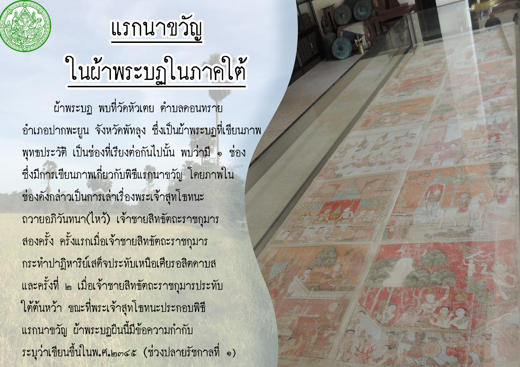 ผ้าพระบฏ พบที่วัดหัวเตย ตำบลดอนทราย อำเภอปากพะยูน จังหวัดพัทลุง ซึ่งเป็นผ้าพระบฏที่เขียนภาพพุทธประวัติ เป็นช่องที่เรียงต่อกันไปนั้น พบว่ามี ๑ ช่อง ซึ่งมีการเขียนภาพเกี่ยวกับพิธีแรกนาขวัญ โดยภาพในช่องดังกล่าวเป็นการเล่าเรื่องพระเจ้าสุทโธทนะถวายอภิวันทนา(ไหว้) เจ้าชายสิทธัตถะราชกุมาร สองครั้ง ครั้งแรกเมื่อเจ้าชายสิทธัตถะราชกุมาร กระทำปาฎิหาริย์เสด็จประทับเหนือเศียรอสิตดาบส และครั้งที่ ๒ เมื่อเจ้าชายสิทธัตถะราชกุมารประทับใต้ต้นหว้า ขณะที่พระเจ้าสุทโธทนะประกอบพิธี แรกนาขวัญ ผ้าพระบฏผืนนี้มีข้อความกำกับระบุว่าเขียนขึ้นในพ.ศ.๒๓๔๕ (ช่วงปลายรัชกาลที่ ๑)