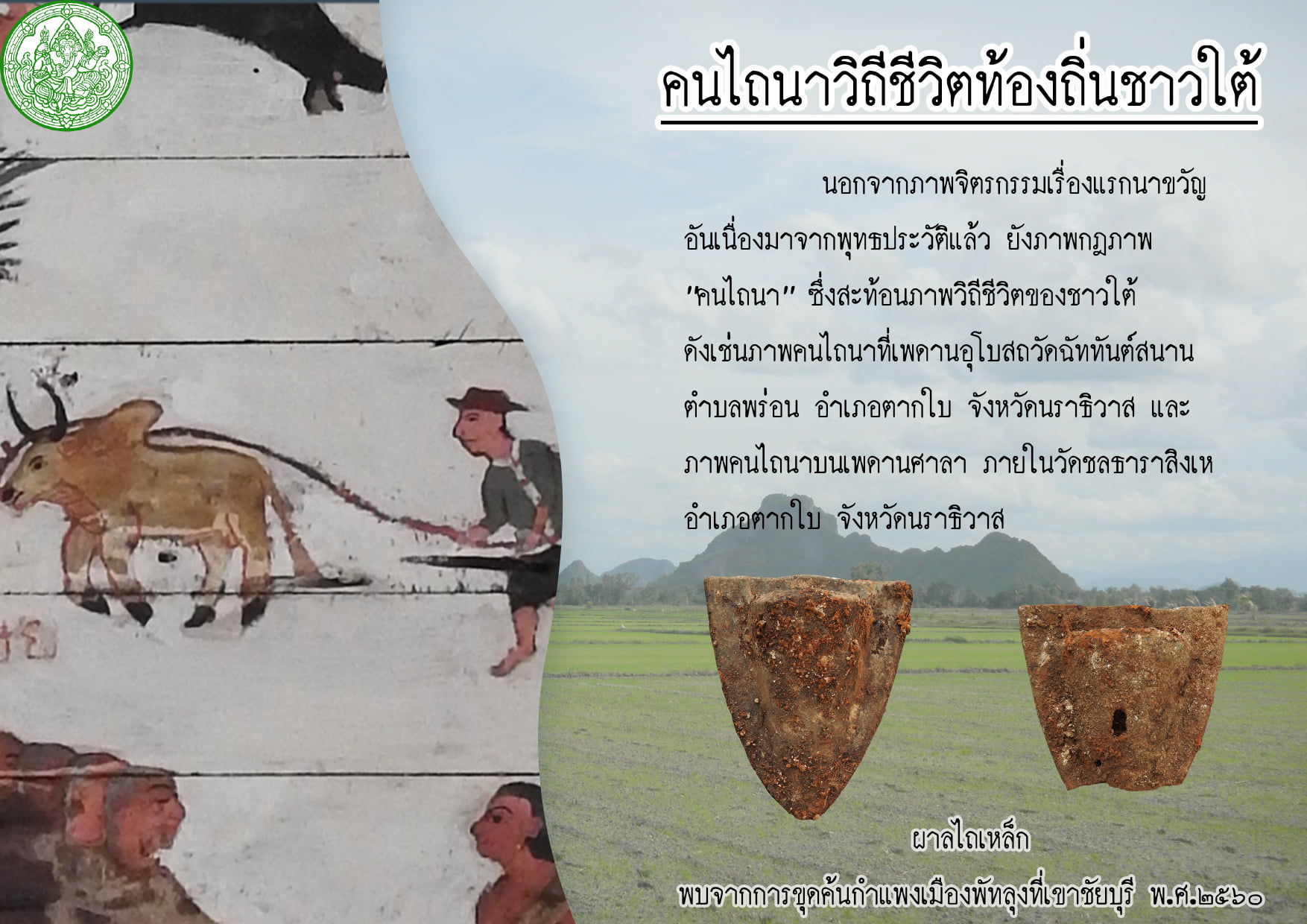 นอกจากภาพจิตรกรรมเรื่องแรกนาขวัญอันเนื่องมาจากพุทธประวัติแล้ว ยังภาพกฎภาพ “คนไถนา” ซึ่งสะท้อนภาพวิถีชิวิตของชาวใต้ ดังเช่นภาพคนไถนาที่เพดานอุโบสถวัดฉัททันต์สนาน ตำบลพร่อน อำเภอตากใบ จังหวัดนราธิวาส และภาพคนไถนาบนเพดานศาลา ภายในวัดชลธาราสิงเห ตำบลเจ๊ะเห อำเภอตากใบ จังหวัดนราธิวาส ซึ่งภาพจิตรกรรมทั้งสองภาพนี้สันนิษฐานว่าเขียนขึ้นราวกลางสมัยรัชกาลที่ ๘ ถึงช่วงต้นรัชกาลที่ ๙