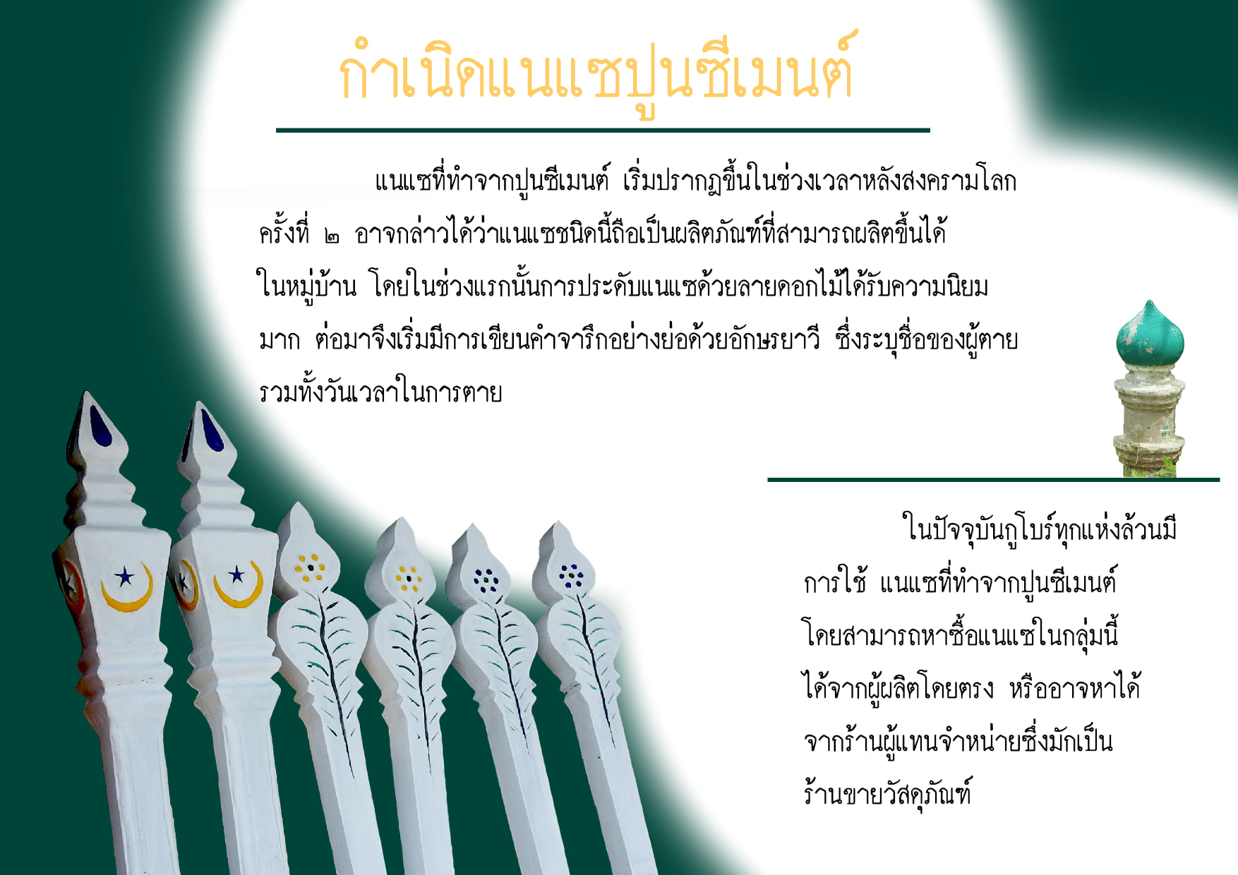 แนแซที่ทำจากปูนซีเมนต์ เริ่มปรากฎขึ้นในช่วงเวลาหลังสงครามโลกครั้งที่ ๒ อาจกล่าวได้ว่าแนแซชนิดนี้ถือเป็นผลิตภัณฑ์ที่สามารถผลิตขึ้นได้ในหมู่บ้าน โดยในช่วงแรกนั้นการประดับแนแซด้วยลายดอกไม้ได้รับความนิยมมาก ต่อมาจึงเริ่มมีการเขียนคำจารึกอย่างย่อด้วยอักษรยาวี ซึ่งระบุชื่อของผู้ตาย รวมทั้งวันเวลาในการตาย