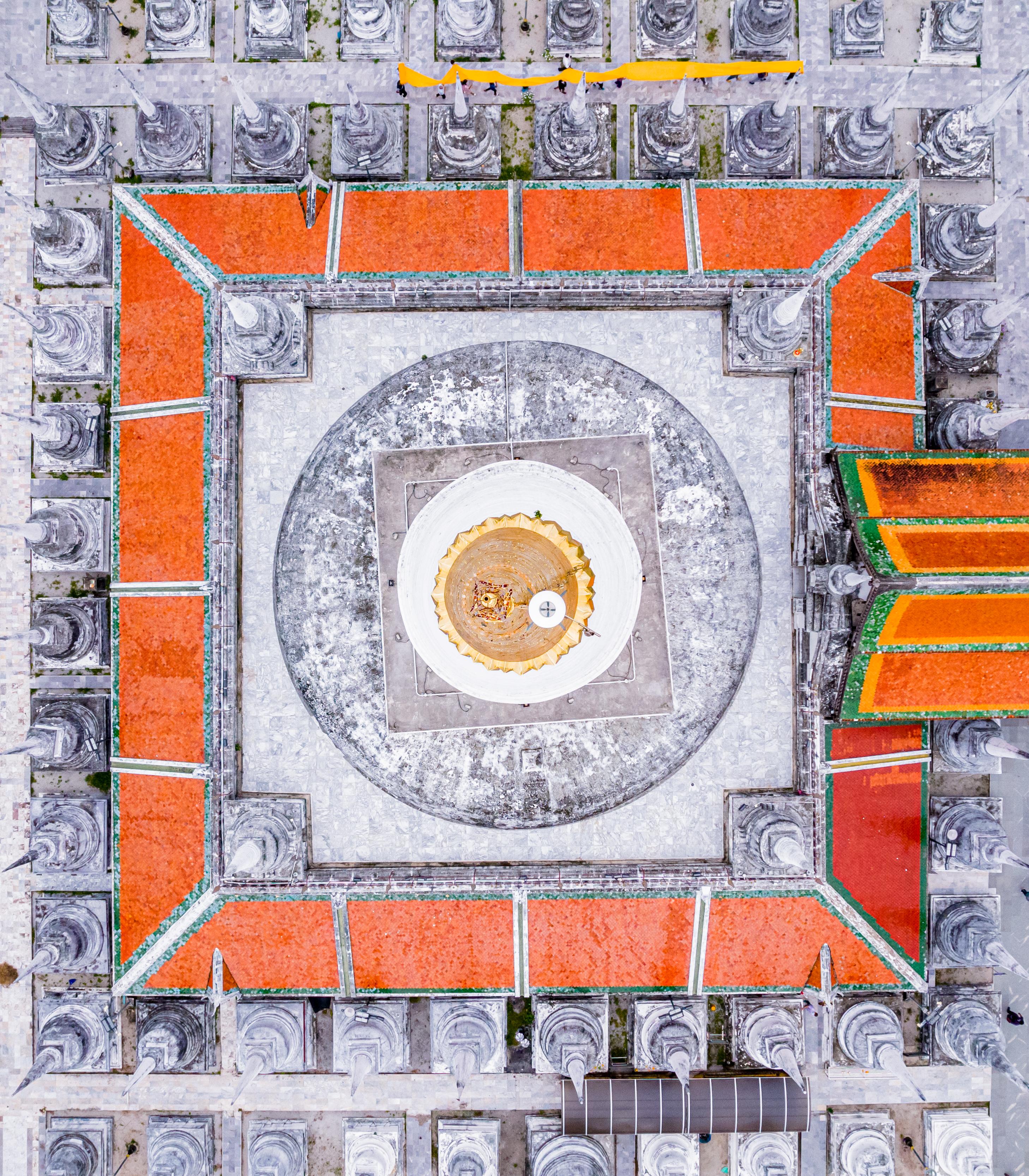 ผังมณฑลนี้ใช้ในสถาปัตยกรรมฮินดูและบ่อยครั้งใช้ในการจัดวางสถาปัตยกรรมพุทธศาสนามหายาน ตัวอย่างที่เด่นชัดคือแผนผังวัดพุทธศาสนามหายานในชวาภาคกลาง (อินโดนีเซีย) อายุราว พุทธศตวรรษที่ 13 - 14 เช่น บุโรพุทโธ วัดเซวู และวัดเพลาสัน รวมถึงโบราณสถานเขาคลังนอก (เมืองโบราณศรีเทพ ภาคกลางตอนบนของไทย) ซึ่งมีเทวาลัยฮินดูเพียงไม่กี่แห่งที่ใช้ผังมณฑลนี้ เช่น วัดปรัมบานัน (ชวาภาคกลาง) ในพุทธศตวรรษที่ 14 และพนมบาแค็ง (เมืองพระนคร ประเทศกัมพูชา) ราวปลายพุทธศตวรรษที่ 13 เห็นได้ชัดว่าผังมณฑลนี้เป็นที่นิยมมากที่สุดในชวาภาคกลาง วัดทั้งหมดที่กล่าวถึงนี้ปัจจุบันถูกทิ้งร้าง ข้อเท็จจริงนี้ทำให้พระบรมธาตุเจดีย์ที่วัดพระมหาธาตุซึ่งยังคงมีการใช้งานเป็นตัวอย่างที่มีอายุยืนยาวที่สุดของผังในลักษณะมณฑลในภูมิภาคเอเชียตะวันออกเฉียงใต้ภาคพื้นสมุทร