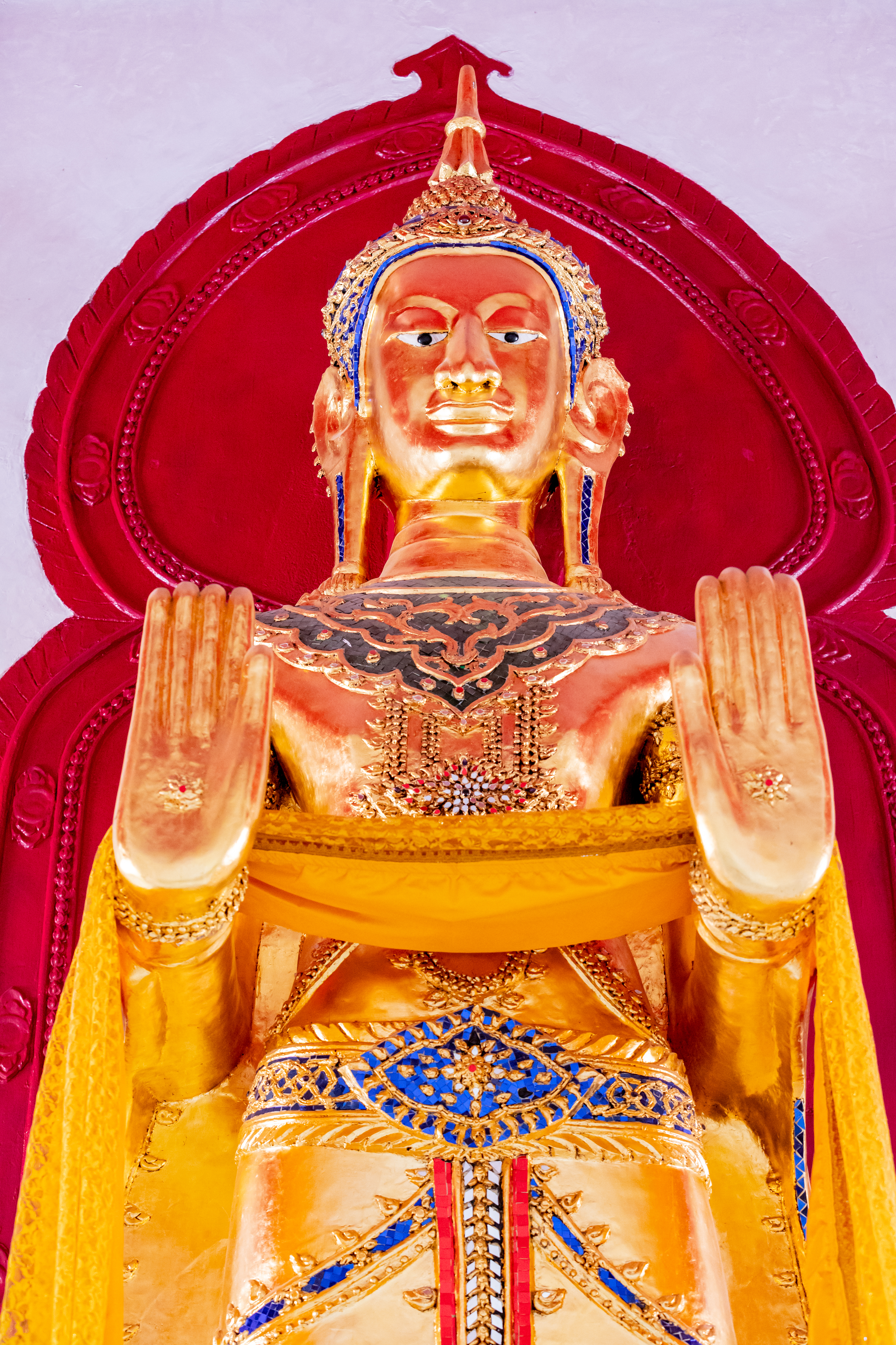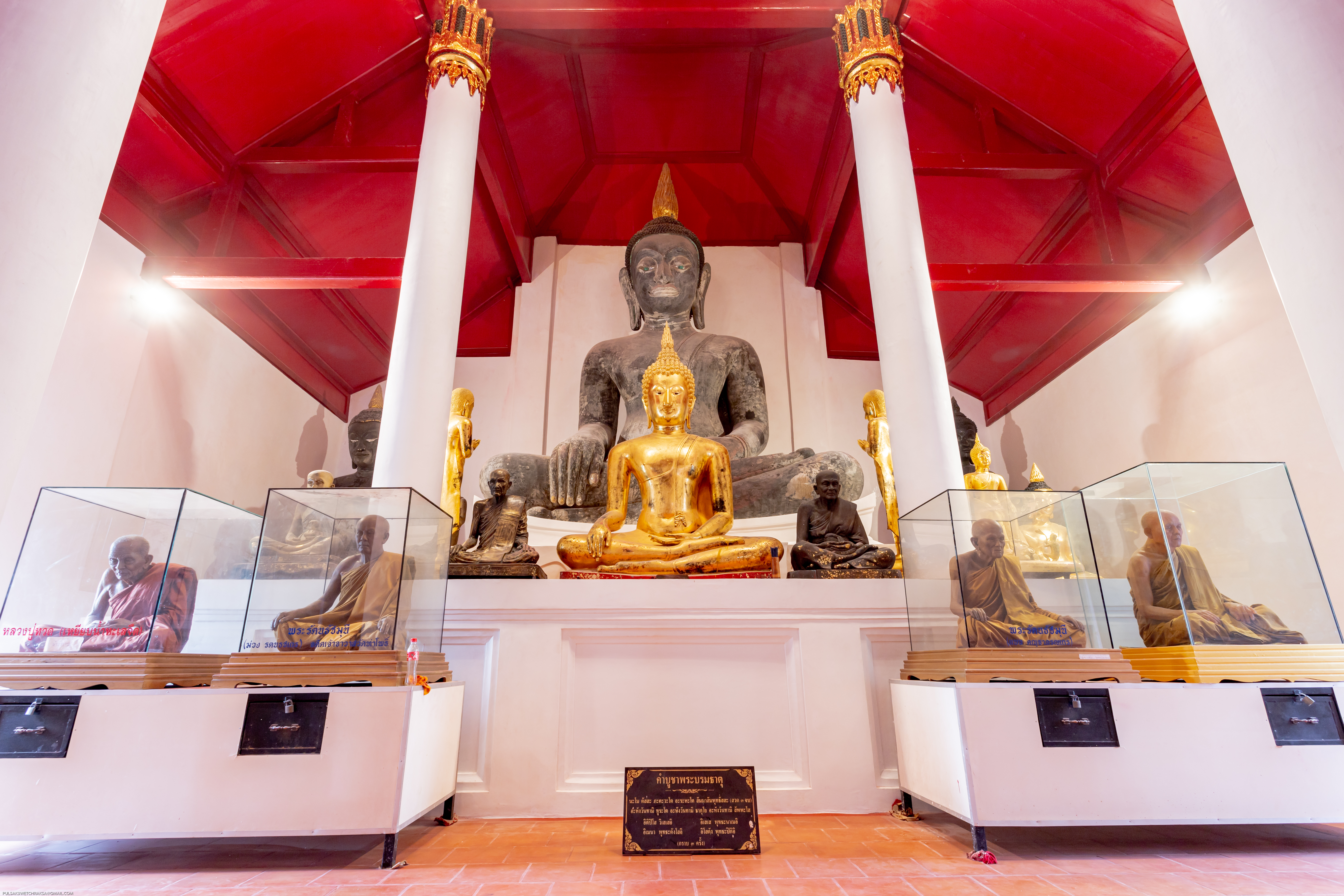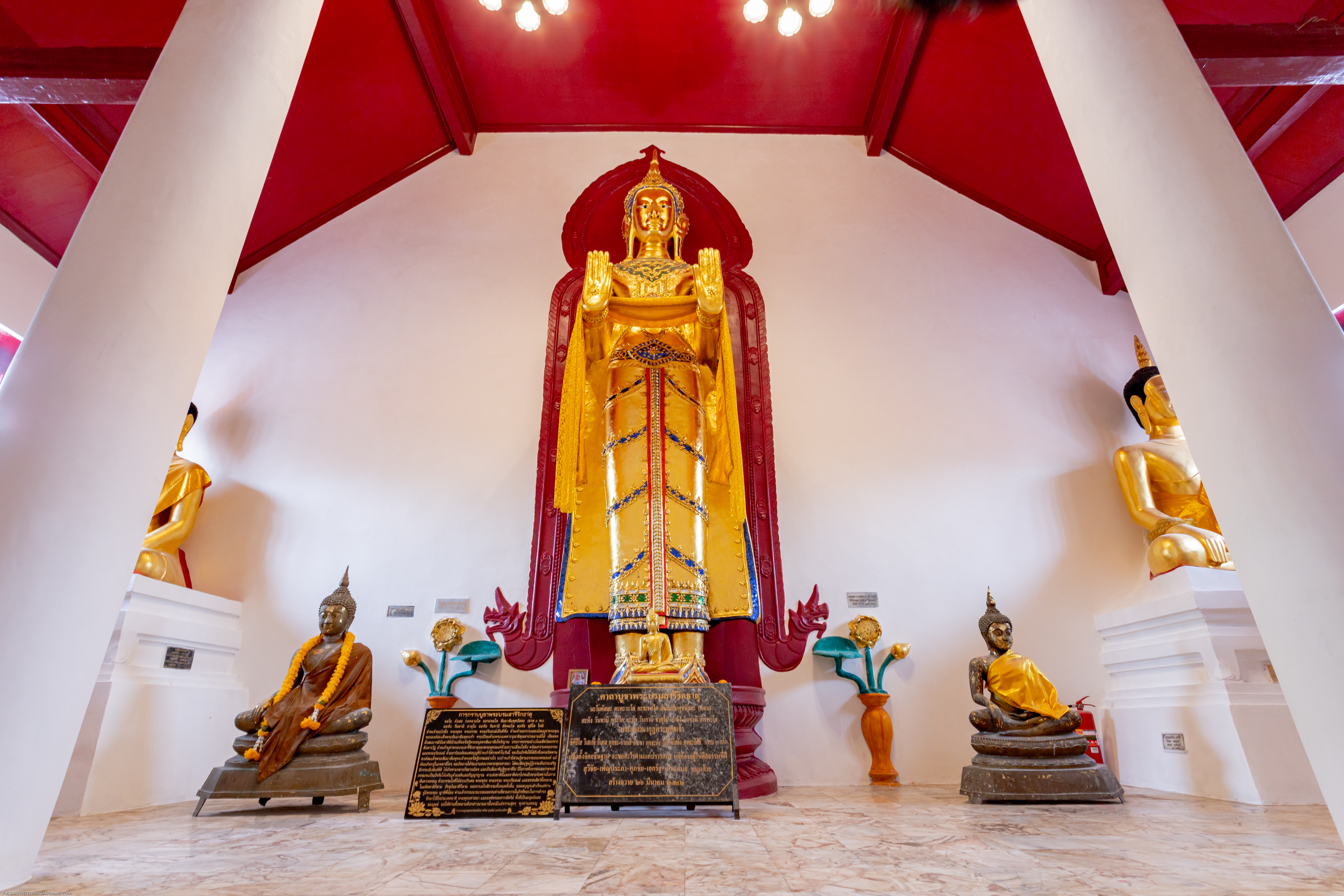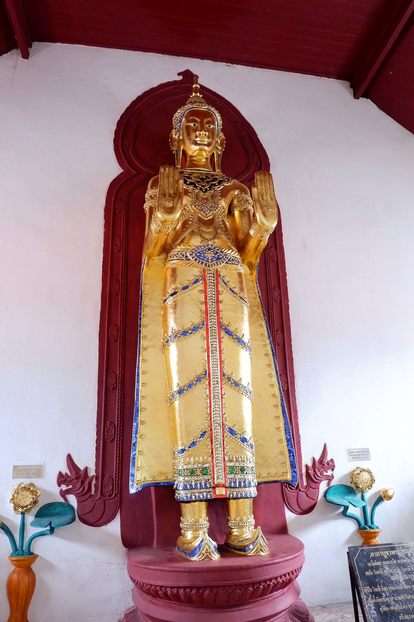 สันนิษฐานว่าในตอนแรกวิหารนี้เป็นโครงสร้างเปิดที่ไม่มีผนัง หลังจากที่ได้รับการเปลี่ยนแปลงให้เป็นวิหารปิด จึงได้มีการสร้างพระพุทธปฏิมายืนทรงเครื่อง 2 องค์ขึ้น องค์แรกชื่อว่า พระนางเหมชาลา (สูง 5.8 เมตร) ตั้งอยู่ที่ส่วนท้ายของวิหาร ขณะที่องค์ที่สองชื่อว่า พระทนทกุมาร (สูง 8.40 เมตร) ตั้งอยู่ด้านหน้าของวิหาร ตามตำนานท้องถิ่นกล่าวว่า พระนางเหมชาลาและพระทนทกุมาร เป็นผู้ที่นำพระบรมสารีริกธาตุมายังสถานที่แห่งนี้ พระทนทกุมารถือว่าเป็นพระพุทธรูปทรงเครื่องที่ใหญ่ที่สุดในประเทศไทย ขณะที่พระพุทธรูปเหมชาลามีเอกลักษณ์ด้วยรูปทรงและลักษณะใบหน้าเป็นสตรี พระพุทธรูปยืนทั้งสององค์นี้อาจมีความเกี่ยวข้องกับการสร้างพระอัฏฐารส หมายถึงพระพุทธรูปยืนสูง 18 ศอก ซึ่งเป็นแนวคิดที่แพร่หลายตามขนบทางสถาปัตยกรรมในเอเชียตะวันออกเฉียงใต้ภาคพื้นทวีป โดยเฉพาะที่พุกาม สุโขทัย และอยุธยา พระพุทธปฏิมายืนทรงเครื่อง 2 องค์นี้ถือเป็นหลักฐานของการแลกเปลี่ยนวัฒนธรรมและการรับมาใช้ในการสร้างพระพุทธรูปขนาดใหญ่ตามประเพณีของสุโขทัย และอยุธยา