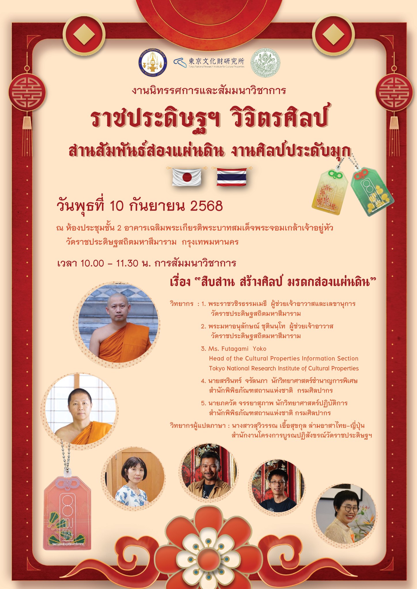สำนักช่างสิบหมู่ ขอเชิญชวนผู้ที่สนใจร่วมฟังคำตอบเหล่านี้ได้ในการสัมมนาวิชาการ “ราชประดิษฐฯ วิจิตรศิลป์ สานสัมพันธ์สองแผ่นดิน งานศิลป์ประดับมุก” ณ อาคารเฉลิมพระเกียรติฯ ชั้น 2 ณ วัดราชประดิษฐสถิตมหาสีมาราม ในวันพุธที่ 10 กันยายน 2568 เวลา 10.00 - 11.30 น. พบกับการสัมมนา เรื่อง “สืบสาน สร้างศิลป์ มรดกสองแผ่นดิน” โดยวิทยากร :