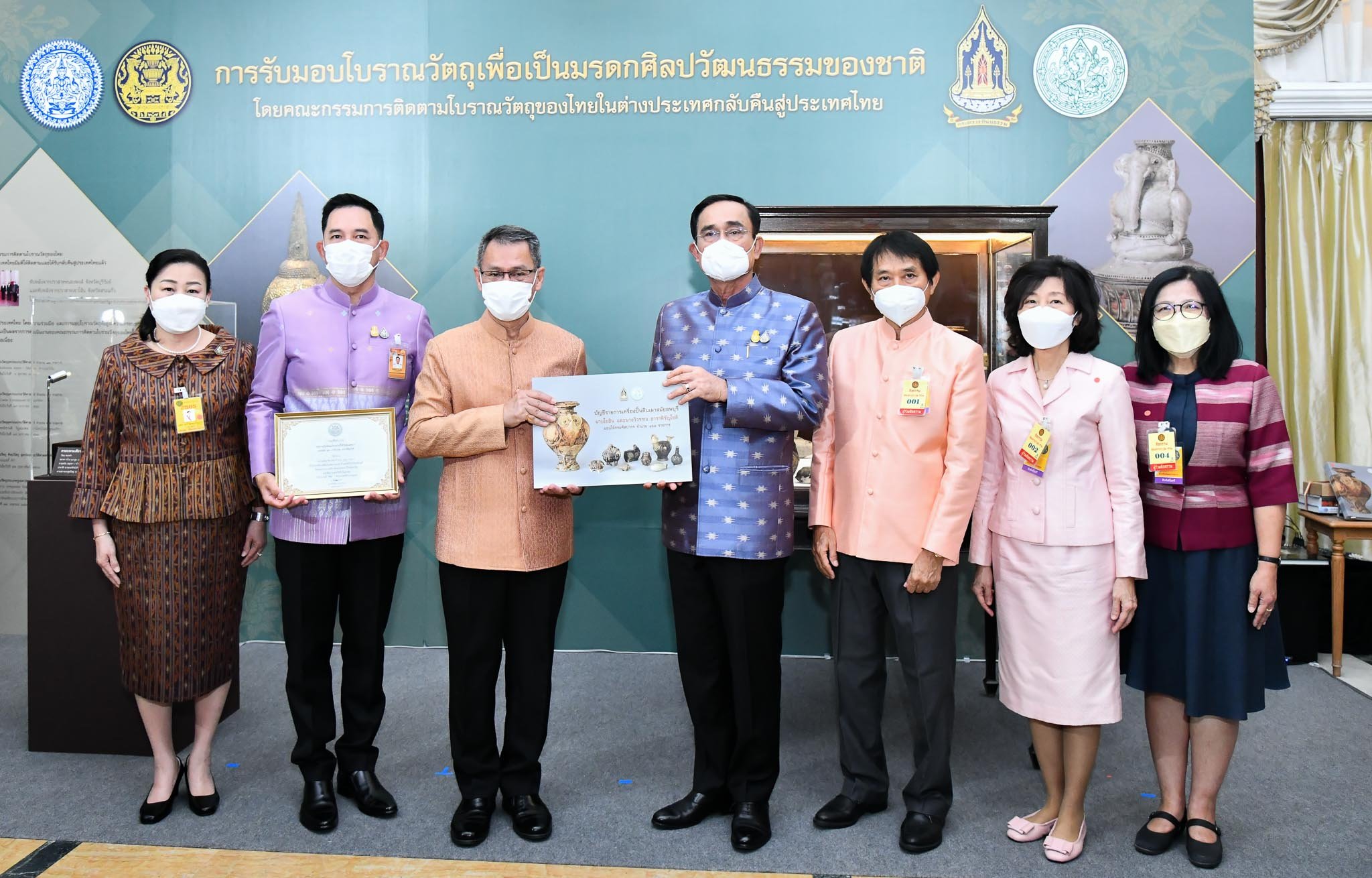 วันอังคารที่ ๑๔ มิถุนายน พุทธศักราช ๒๕๖๕ เวลา ๐๘.๔๕ น. นายอิทธิพล คุณปลื้ม รัฐมนตรีว่าการกระทรวงวัฒนธรรม พร้อมด้วยนางยุพา ทวีวัฒนะกิจบวร ปลัดกระทรวงวัฒนธรรม นายกิตติพันธ์ พานสุวรรณ อธิบดีกรมศิลปากร นางสาวนิตยา กนกมงคล ผู้อำนวยการสำนักพิพิธภัณฑสถานแห่งชาติ นายโยธิน ธาราหิรัญโชติ และนางวิวรรณ ธาราหิรัญโชติ ผู้มอบโบราณวัตถุ เข้าพบ พลเอก ประยุทธ์ จันทร์โอชา นายกรัฐมนตรีและรัฐมนตรีว่าการกระทรวงกลาโหม เพื่อรณรงค์ประชาสัมพันธ์การรับมอบโบราณวัตถุ “ครอบพระเศียรทองคำ” ที่รับคืนมาจากสหรัฐอเมริกาและโบราณวัตถุ“เครื่องปั้นดินเผาสมัยลพบุรีจากแหล่งเตาจังหวัดบุรีรัมย์” พร้อมทั้งสมุดบัญชีโบราณวัตถุเครื่องปั้นดินเผาสมัยลพบุรีจำนวน ๑๖๔ รายการ เพื่อเป็นมรดกศิลปวัฒนธรรมของชาติ ของคณะกรรมการติดตามโบราณวัตถุของไทยในต่างประเทศกลับคืนสู่ประเทศไทย ณ โถงกลาง ตึกสันติไมตรี ทำเนียบ รัฐบาล