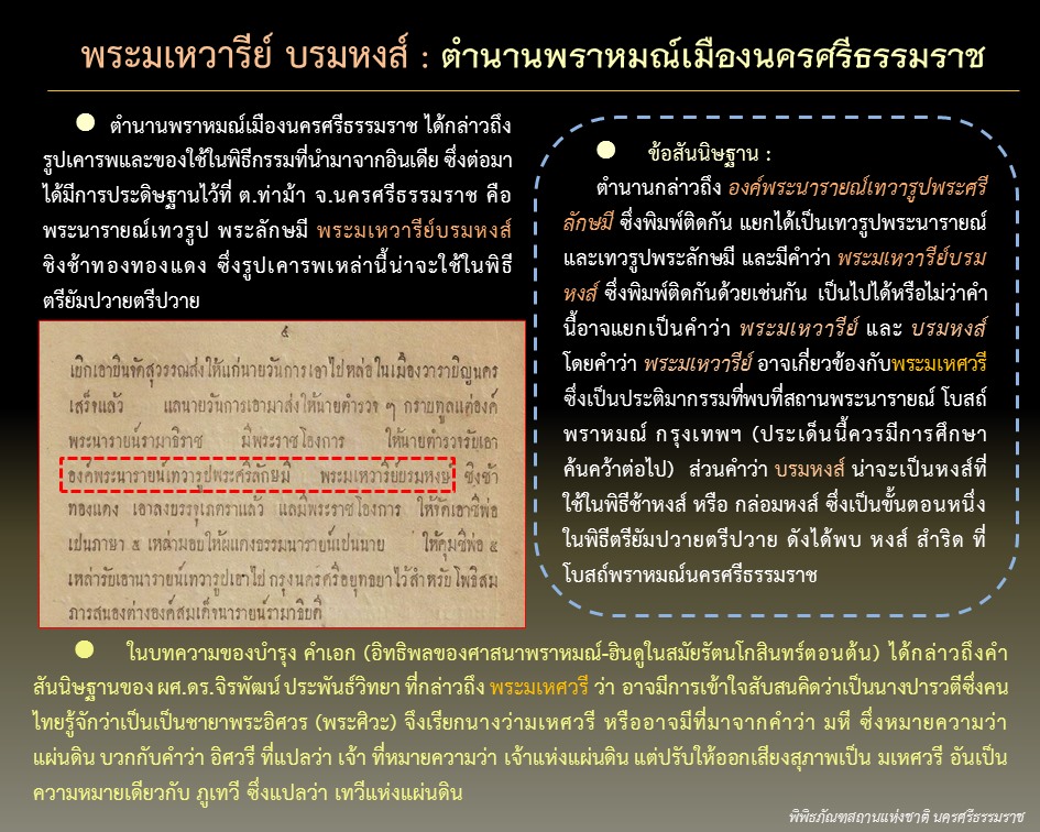 ชุดความรู้ทางวิชาการ หลักฐานศาสนาพราหมณ์-ฮินดูที่พบในภาคใต้ของประเทศไทย : หงส์สำริด โบสถ์พราหมณ์ จากตำนานพราหมณ์เมืองนครศรีธรรมราช