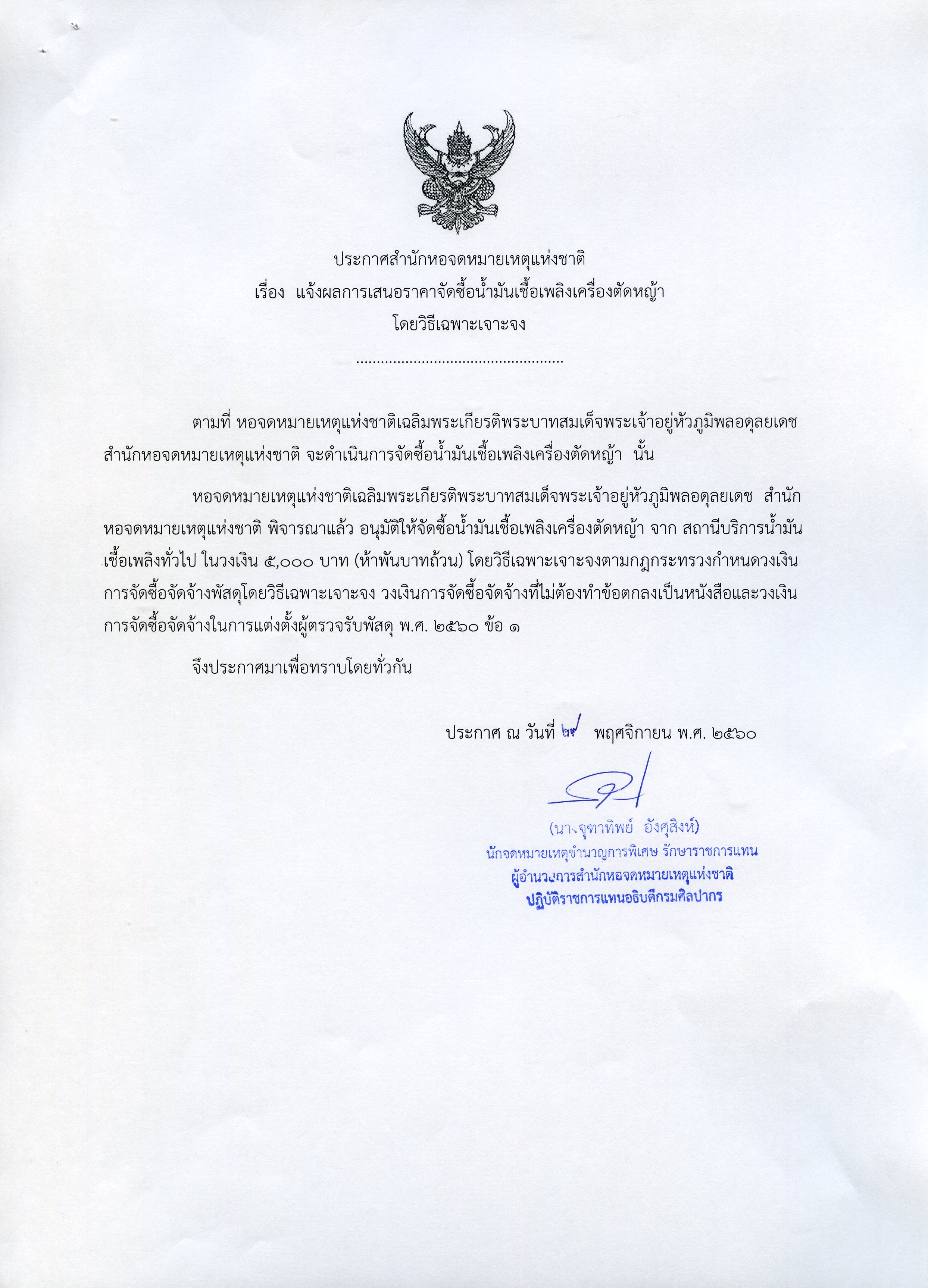 แจ้งผลการเสนอราคาจัดซื้อน้ำมันเชื้อเพลิงเครื่องตัดหญ้า โดยวิธีเฉพาะเจาะจง