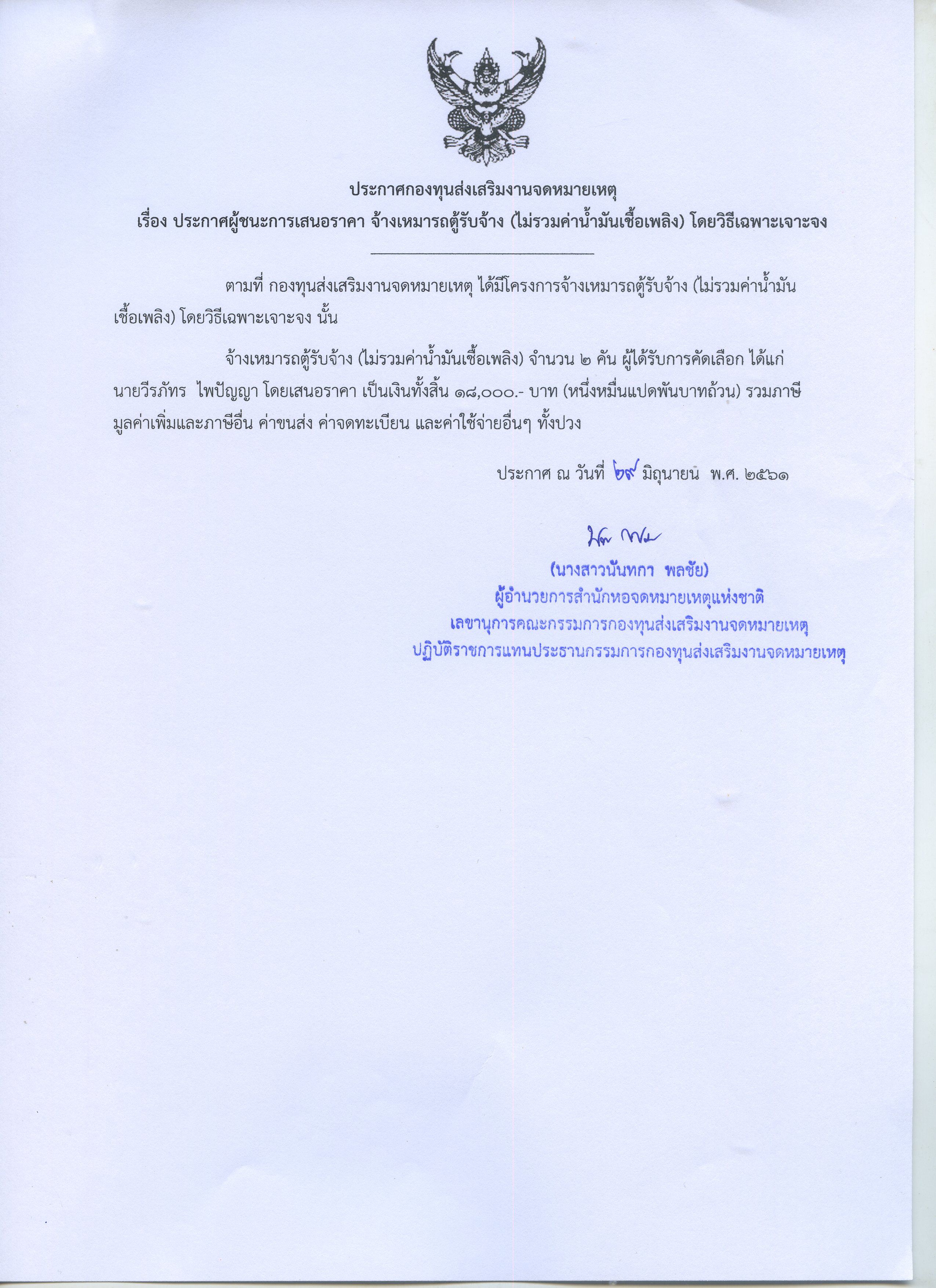 ประกาศผู้ชนะการเสนอราคา จ้างเหมารถตู้รับจ้าง(ไม่ร่วมค่าน้ำมันเชื้อเพลิง) โดยวิธีเฉพาะเจาะจง