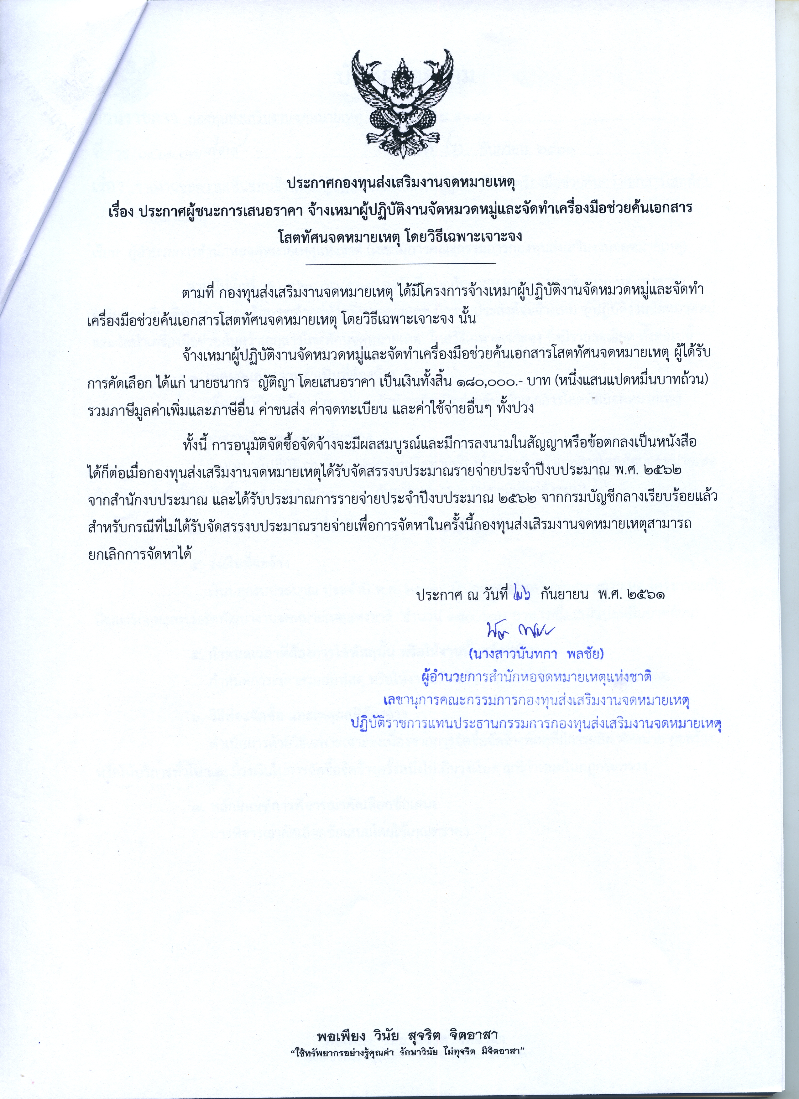 ประกาศผู้ชนะการเสนอราคา จ้างเหมาผู้ปฏิบัติงานจัดหมวดหมู่และจัดทำเครื่องมือช่วยค้นเอกสารโสตทัศนจดหมายเหตุ โดยเฉพาะเจาะจง