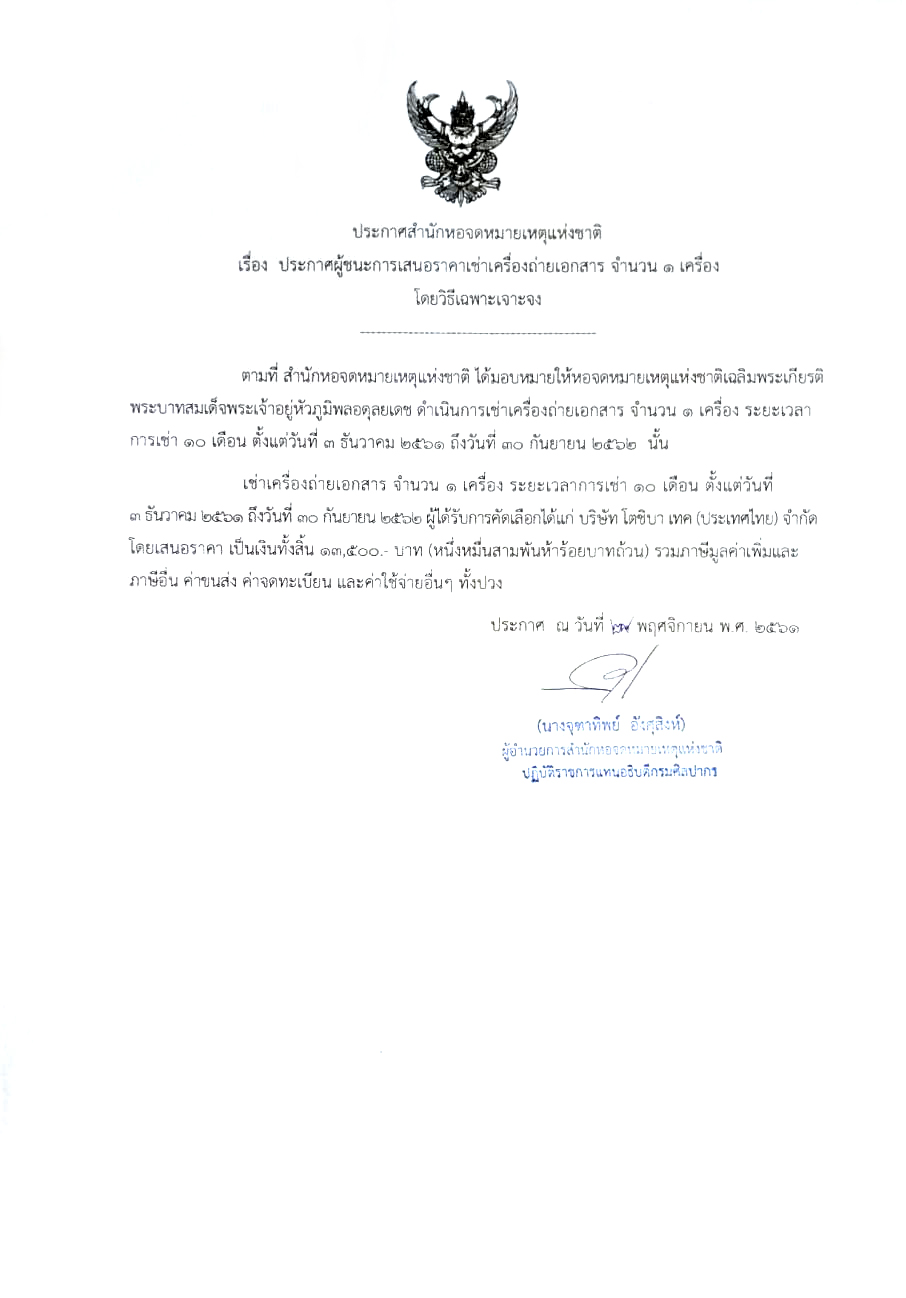 ประกาศผู้ชนะการเสนอราคาเช่าเครื่องถ่ายเอกสาร