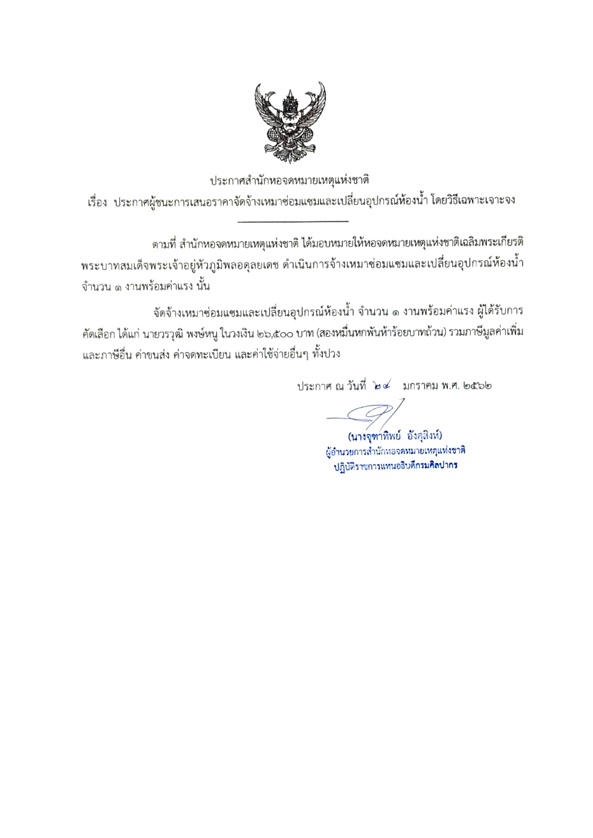 ประกาศผู้ชนะการเสนอราคาจัดจ้างซ่อมแซมและเปลี่ยนอุปกรณ์ห้องน้ำ