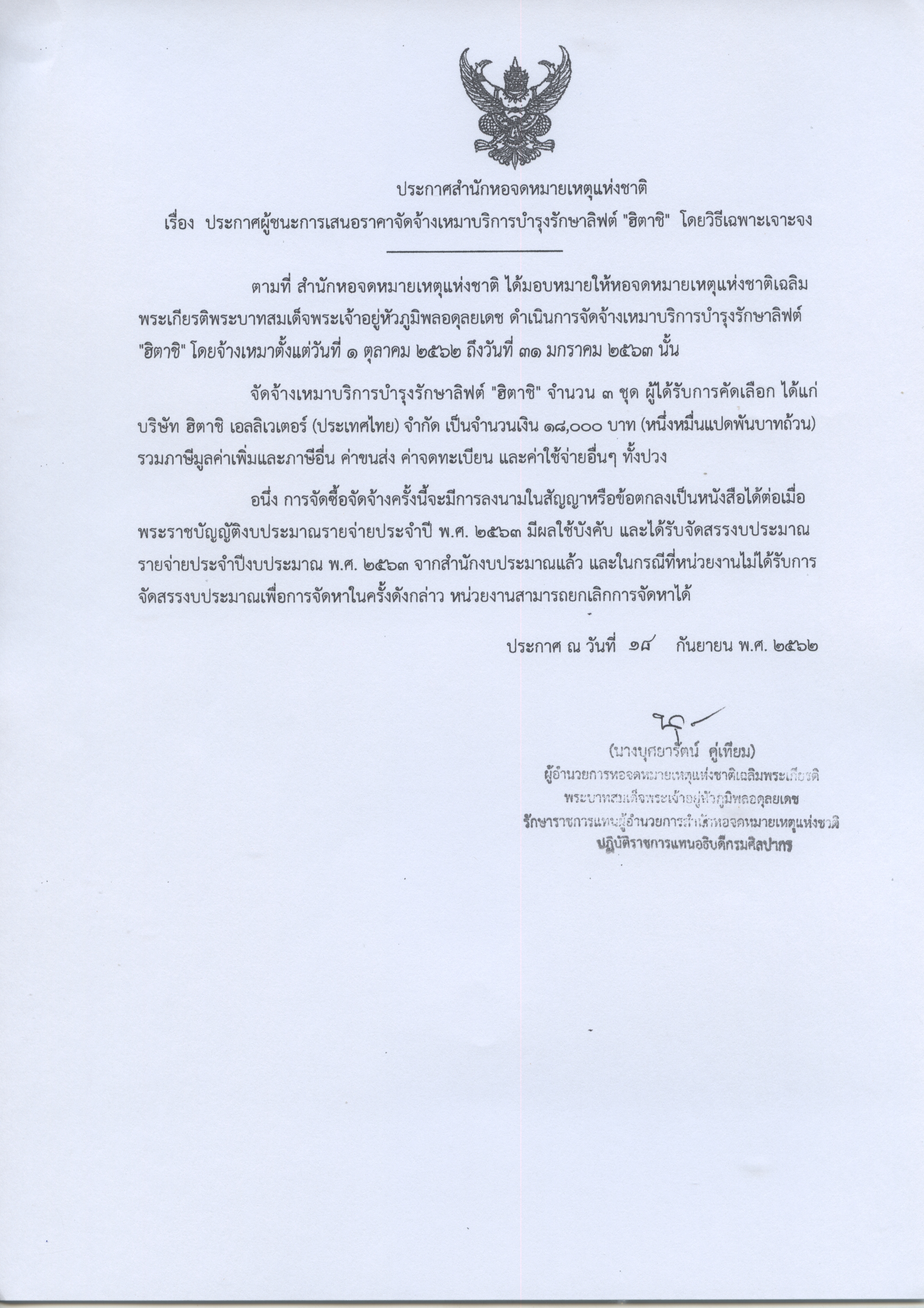 ประกาศผู้ชนะการเสนอราคาจัดจ้างเหมาบริการบำรุงรักษาลิฟต์ "ฮิตาชิ"