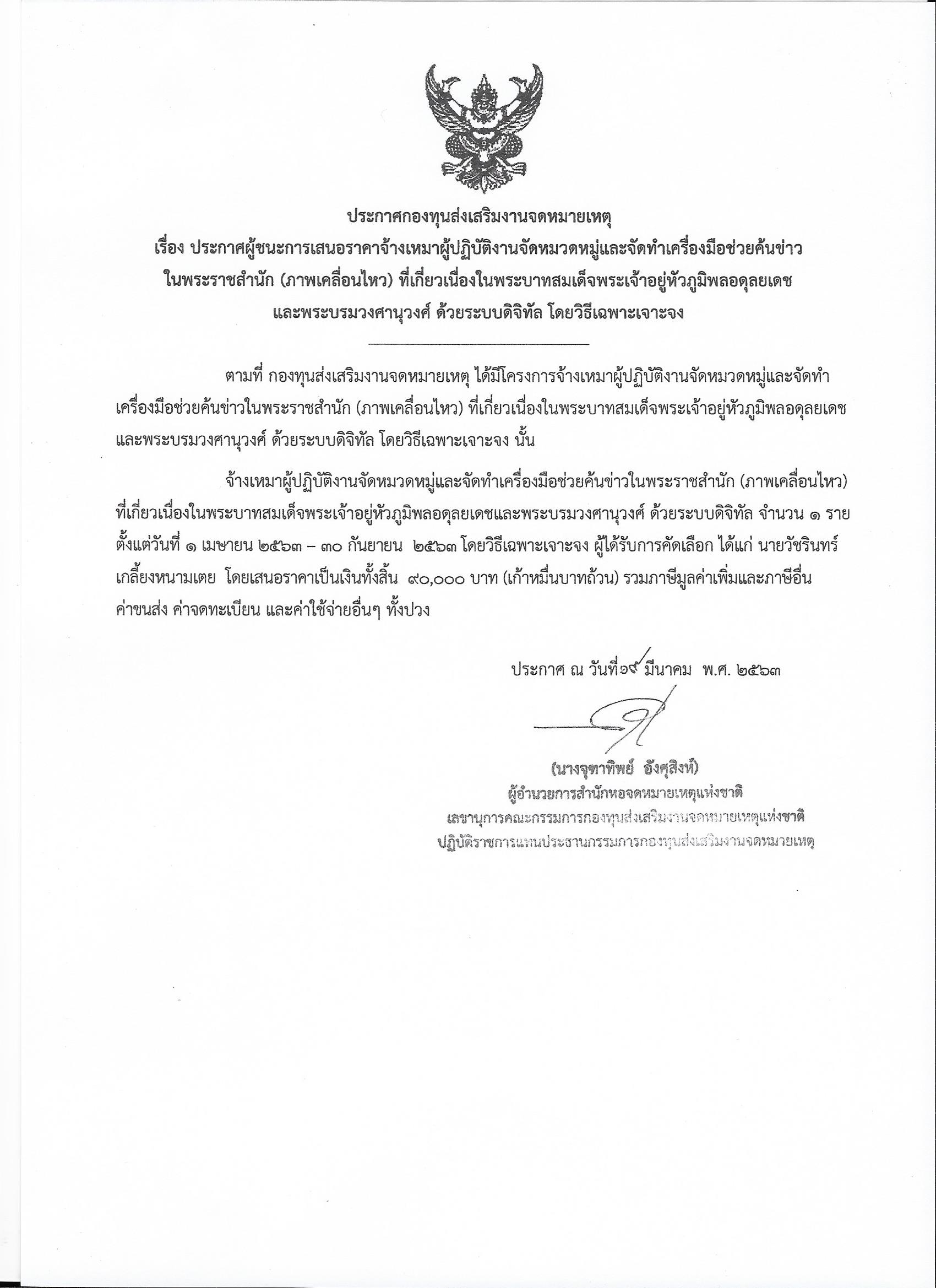 ประกาศผู้ชนะการเสนอราคาจ้างเหมาผู้ปฏิบัติงานจัดหมวดหมู่และจัดทำเครื่องมือช่วยค้นข่าวในพระราชสำนัก (ภาพเคลื่อนไหว) ที่เกี่ยวเนื่องในพระบาทสมเด็จพระเจ้าอยู่หัวภูมิพลอดุลยเดชและพระบรมวงศานุวงศ์ ด้วยระบบดิจิทัล โดยวิธีเฉพาะเจาะจง