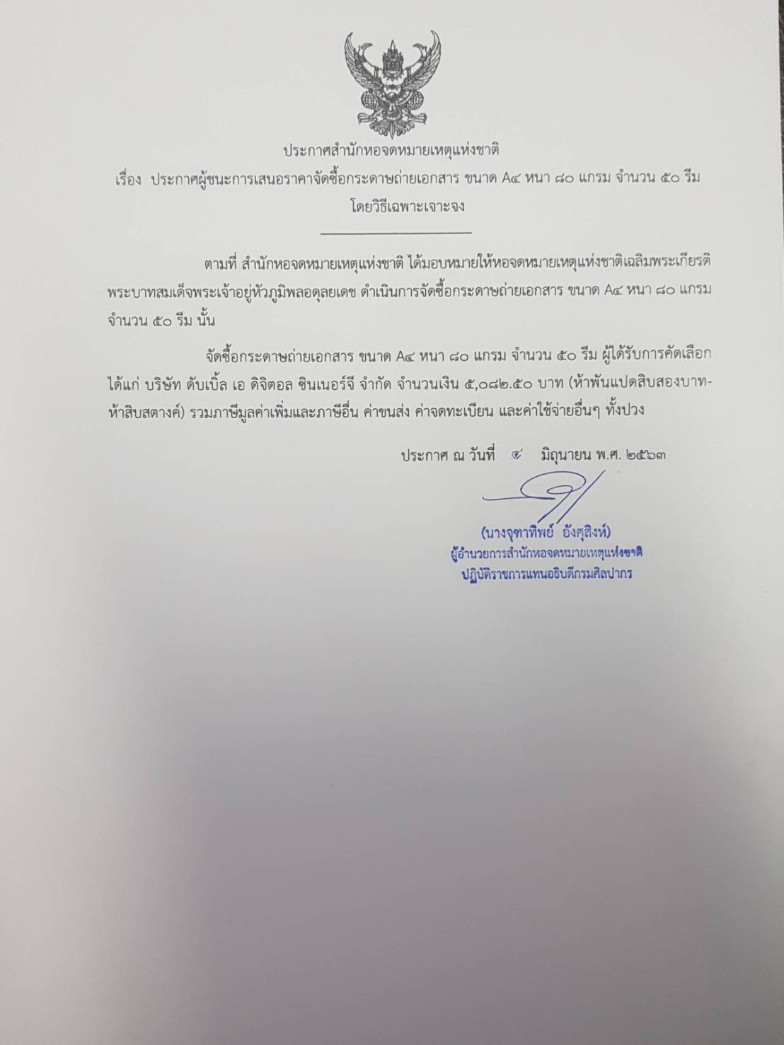 ประกาศผู้ชนะการเสนอราคาจัดซื้อกระดาษถ่ายเอกสาร ขนาด A๔ หนา ๘๐ แกรม จำนวน ๕๐ รีม โดยวิธีเฉพาะเจาะจง