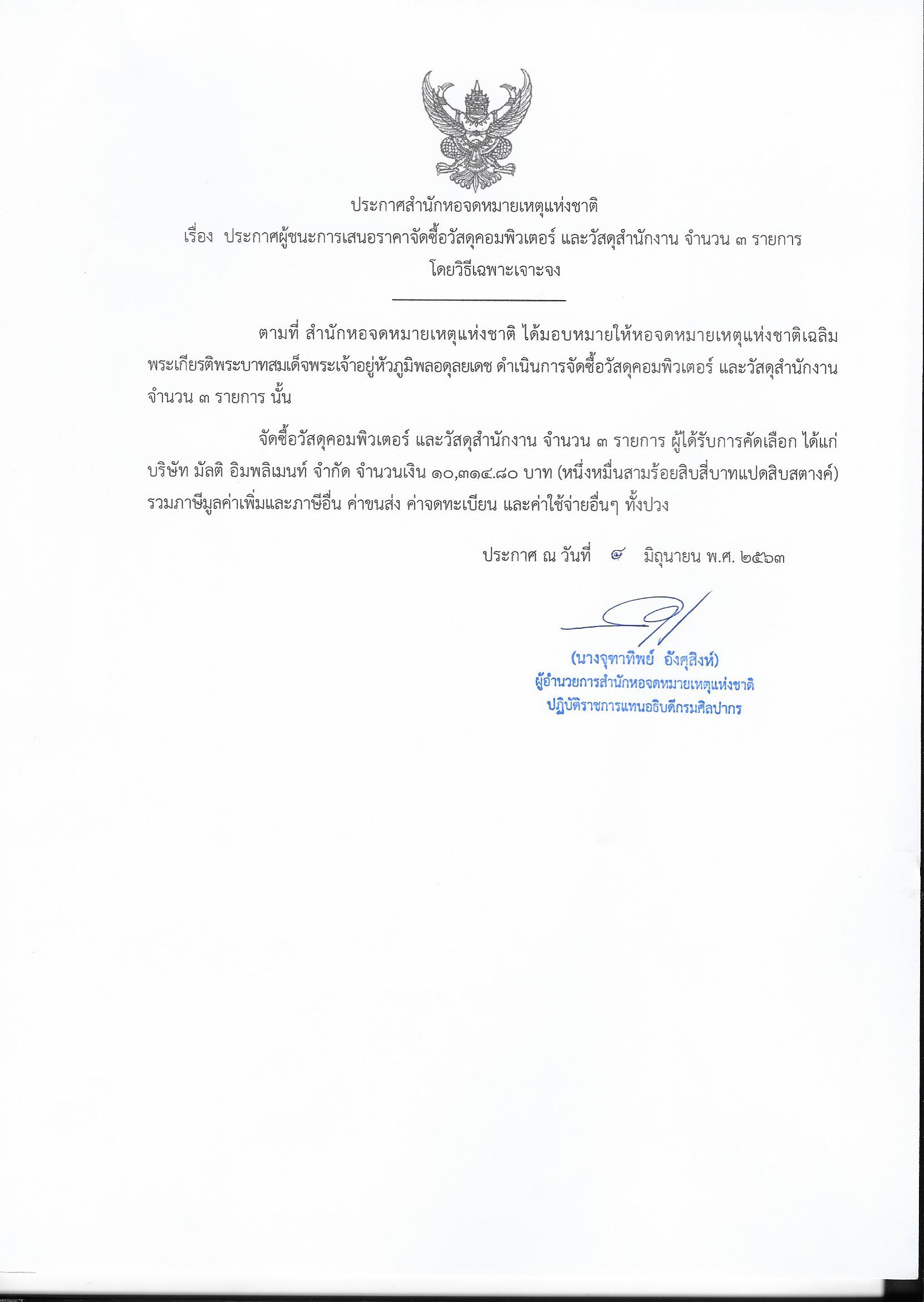 ประกาศผู้ชนะการเสนอราคาจัดซื้อวัสดุคอมพิวเตอร์ และวัสดุสำนักงาน จำนวน ๓ รายการ โดยวิธีเฉพาะเจาะจง