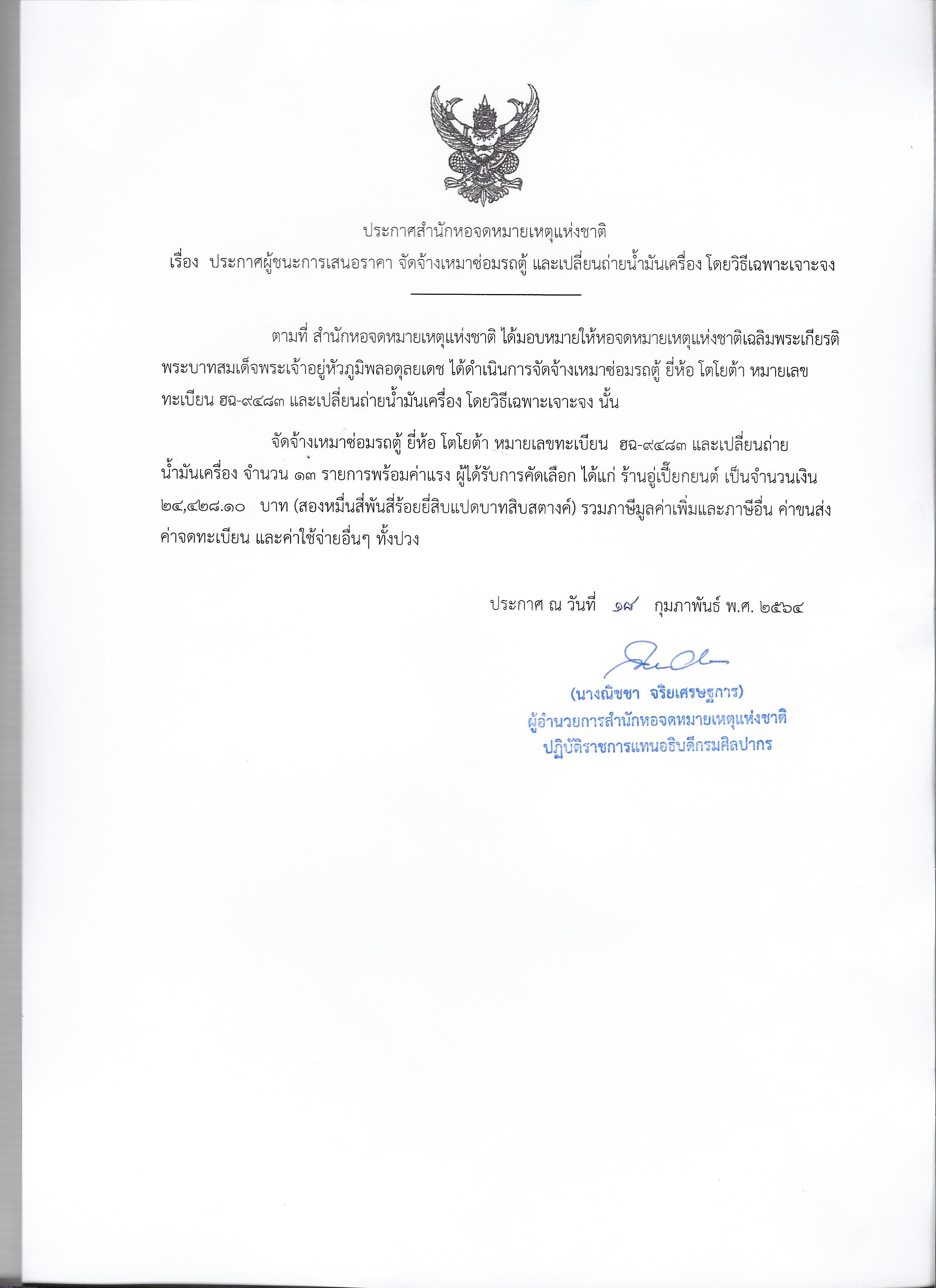 ประกาศสำนักหอจดหมายเหตุแห่งชาติ เรื่อง ประกาศผู้ชนะการเสนอราคาจัดจ้างเหมาซ่อมรถตู้ และเปลี่ยนถ่ายน้ำมันเครื่อง โดยวิธีเฉพาะเจาะจง
