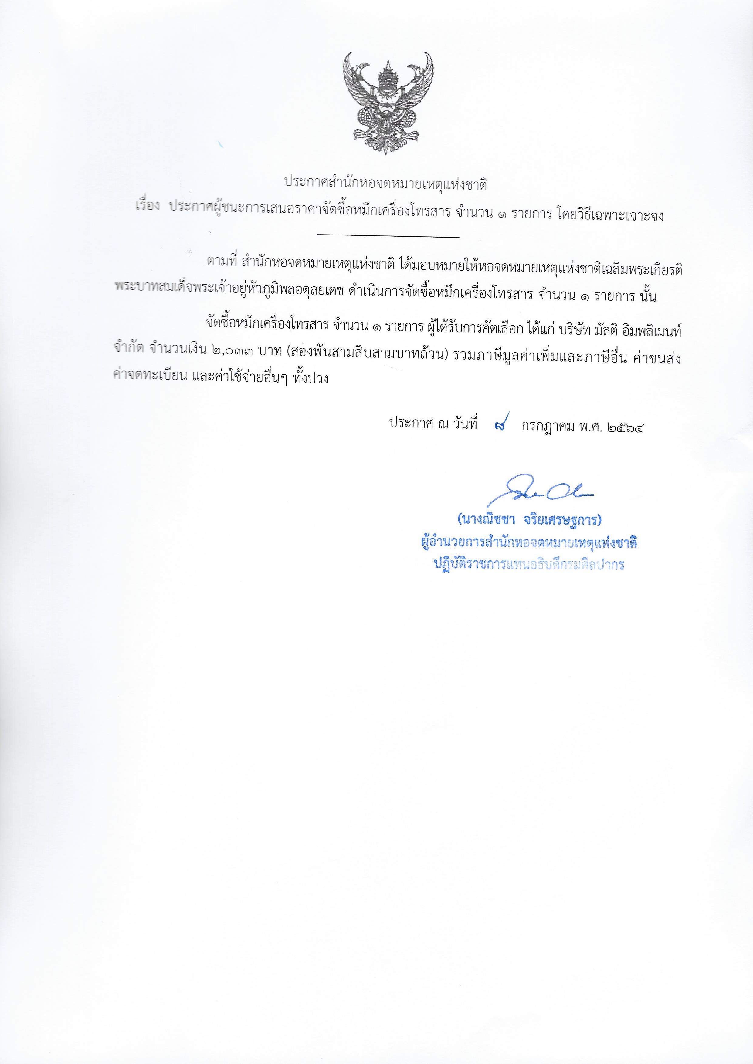 ประกาศสำนักหอจดหมายเหตุแห่งชาติ เรื่อง ประกาศผู้ชนะการเสนอราคาจัดซื้อเครื่องโทรสาร จำนวน ๑ รายการ โดยวิธีเฉพาะเจาะจง