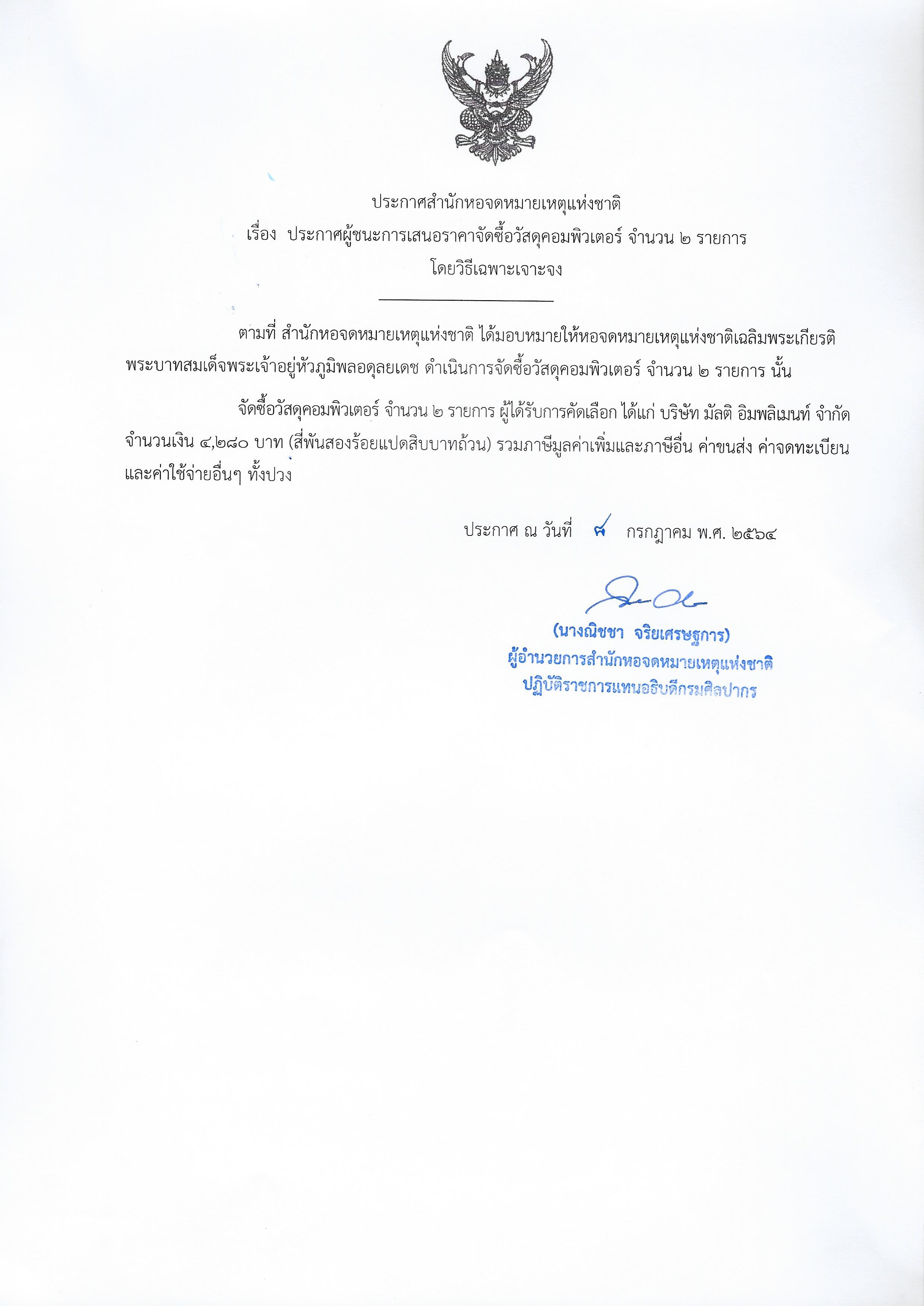 ประกาศสำนักหอจดหมายเหตุแห่งชาติ เรื่อง ประกาศผู้ชนะการเสนอราคาจัดซื้อวัสดุคอมพิวเตอร์ จำนวน ๒ รายการ โดยวิถีเฉพาะเจาะจง