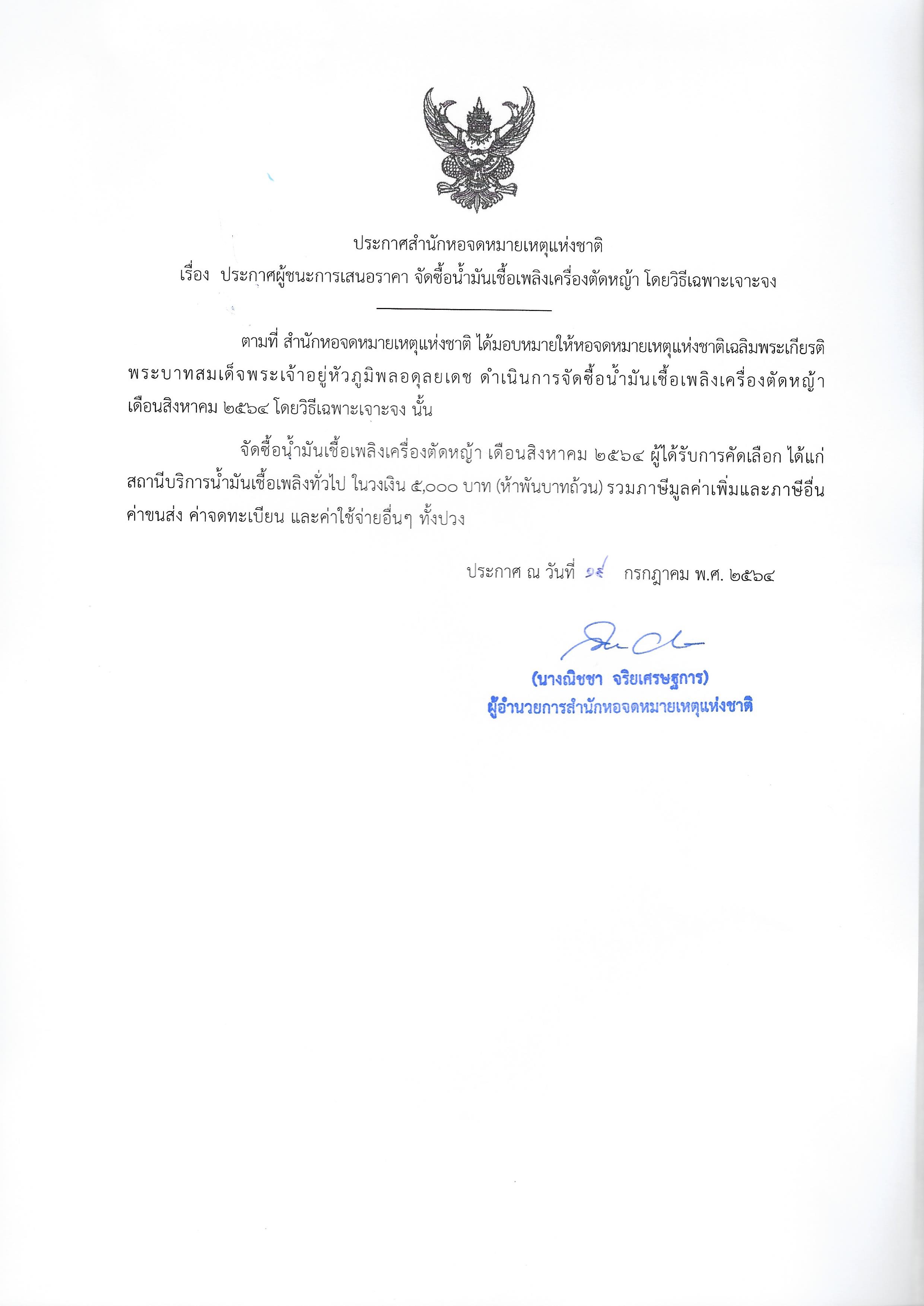 ประกาศสำนักหอจดหมายเหตุแห่งชาติ เรื่อง ประกาศผู้ชนะการเสนอราคา จัดซื้อน้ำมันเชื้อเพลิงเครื่องตัดหญ้า โดยวิธีเฉพาะเจาะจง (เดือนสิงหาคม ๒๕๖๔)