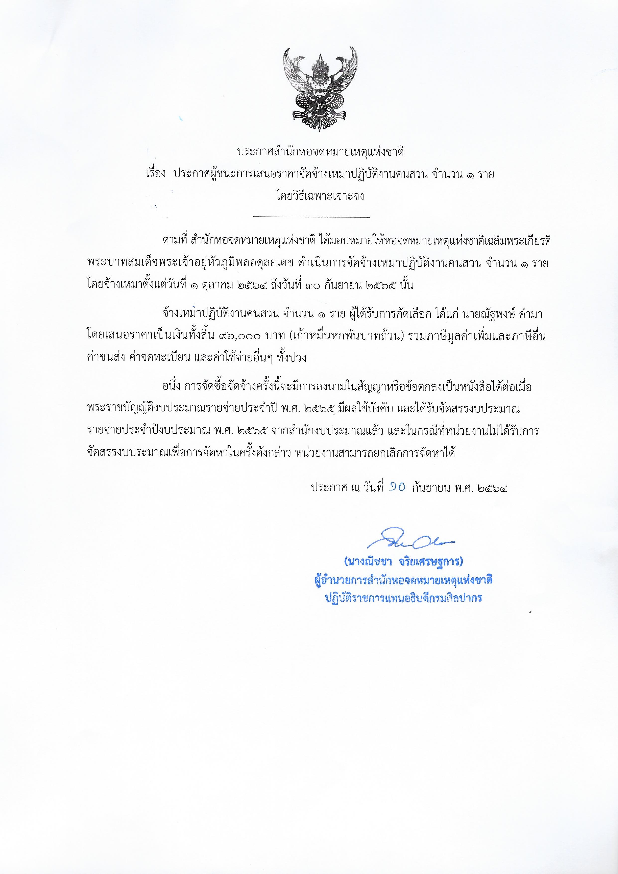 ประกาศสำนักหอจดหมายเหตุแห่งชาติ เรื่อง ประกาศผู้ชนะการเสนอราคาจัดจ้างเหมาปฏิบัติงานคนสวน โดยวิธีเฉพาะเจาะจง_3