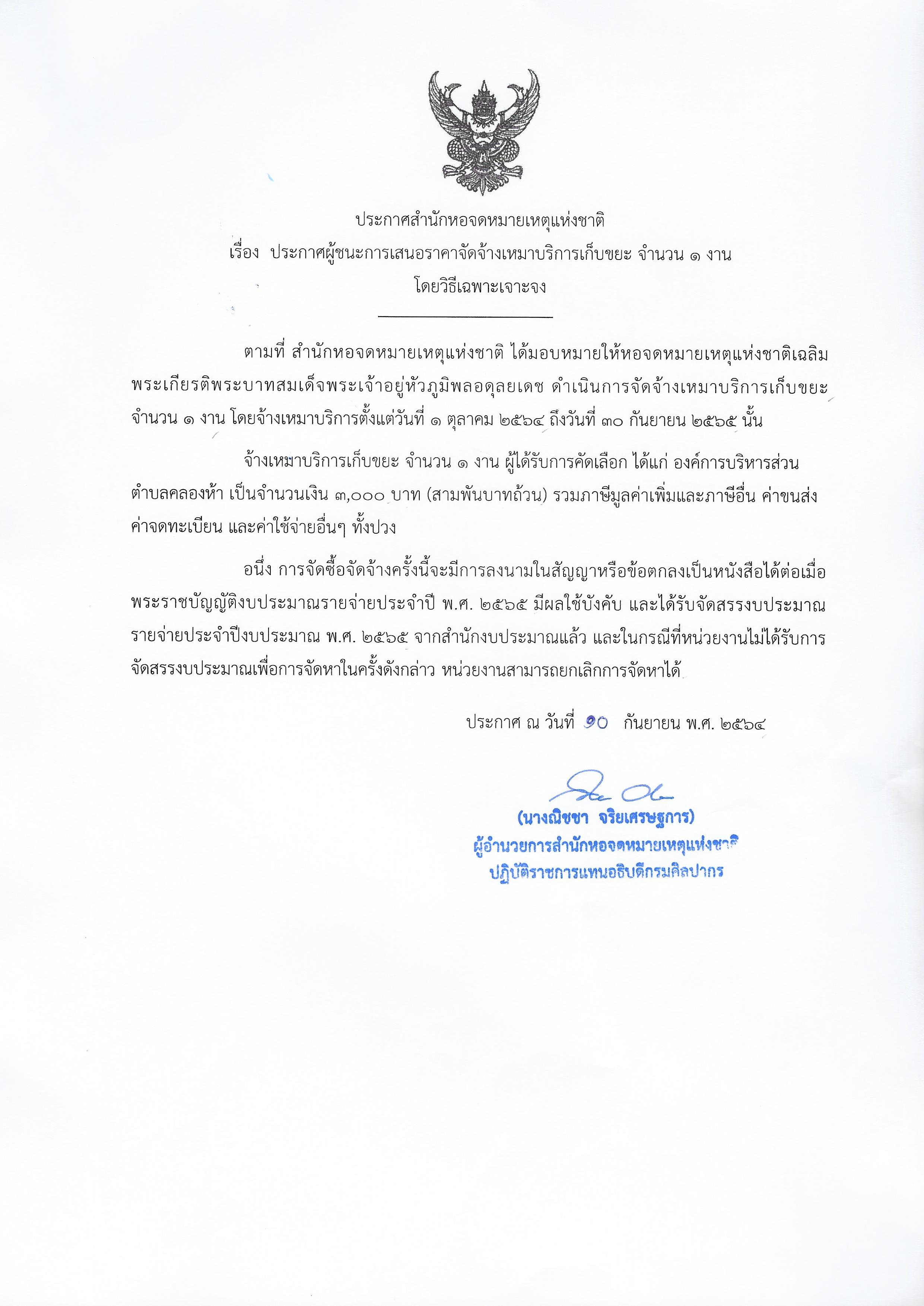 ประกาศสำนักหอจดหมายเหตุแห่งชาติ เรื่อง ประกาศผู้ชนะการเสนอราคาจัดจ้างเหมาเก็บขยะ โดยวิธีเฉพาะเจาะจง