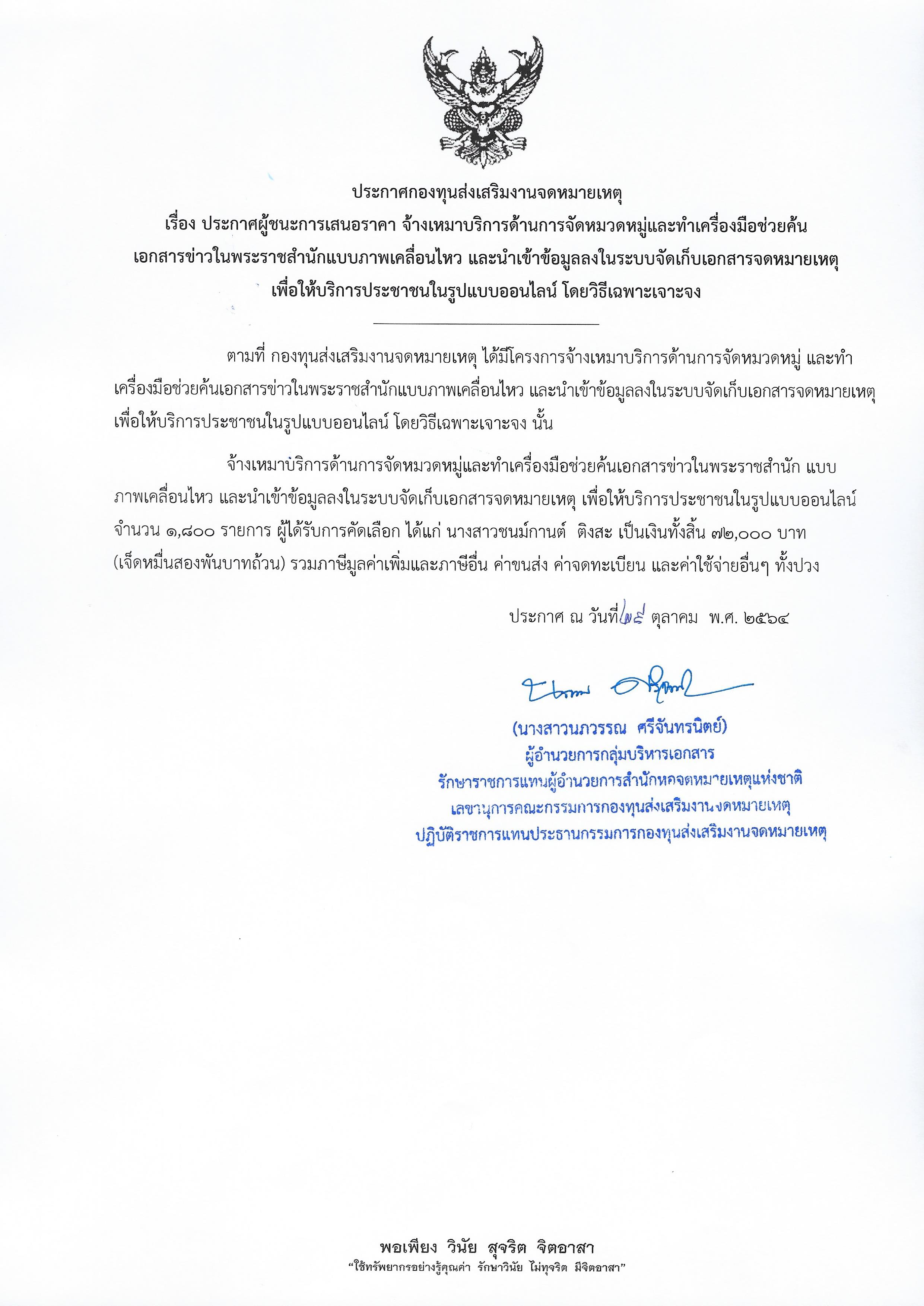 ประกาศกองทุนส่งเสริมงานจดหมายเหตุ เรื่อง ประกาศผู้ชนะการเสนอราคาจ้างเหมาบริการด้านการจัดหมวดหมู่และทำเครื่องมือช่วยค้นเอกสารข่าวในพระราชสำนักแบบภาพเคลื่อนไหว และนำเข้าข้อมูลลงในระบบจัดเก็บเอกสารจดหมายเหตุเพื่อให้บริการประชาชนในรูปแบบออนไลน์ โดยวิธีเฉพาะเจาะจง